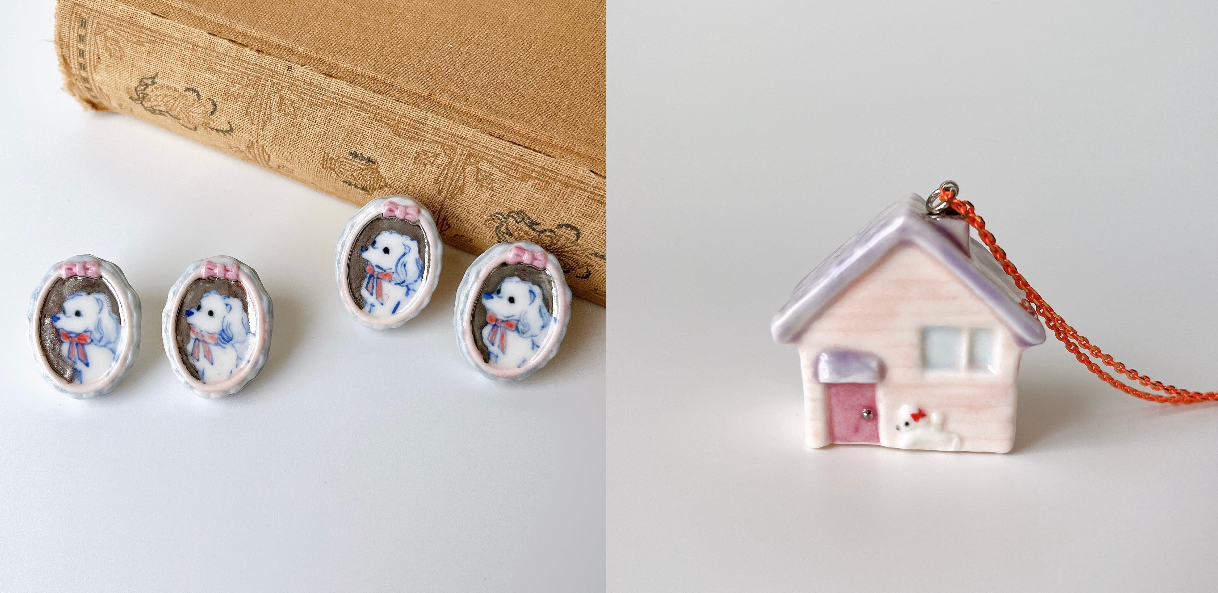 陶芸アーティスト、湯口 萌香さんによるアクセサリーブランド"aimoko"。 「おしゃれをするにも面白がりたい大人のためのアクセサリー」をテーマに、 一つひとつ丁寧に作られています。 身に着けていることで会話のきっかけになるようなおちゃめなアクセサリー、 是非お気に入りを見つけてくださいね。 ・・・・・・・・・・・・・・・・・・・・ 小さい頃に遊んだお人形のおうちみたいなペンダント。 可愛らしくもどこかノスタルジー!入り口ではわんちゃんがお出迎えだよー。 カラーもとっても可愛くって、身に着けない時だってお部屋に飾っておきたくなります。 フリルのブラウスや古着のワンピなんかと合わせたいな。 ・・・・・・・・・・・・・・・・・・・・ 素材:陶磁器・金具(真鍮)・プラABS サイズ: おうち…約 縦3.5×横3.6×奥行2.2cm チェーン…約53cm アジャスターなし *手作りの為、サイズに若干の個体差がある場合がございます。 ・・・・・・・・・・・・・・・・・・・・ *色・釉薬のムラや黒点等が見られる場合がございます。 作品のもつ味としてお楽しみください。 *陶で出来ています、落下や衝撃には十分お気を付けいただき、着脱時は優しくお取り扱いください。 *商品写真はできる限り実物の色味に近づけておりますが、撮影当日の天候やお客様のお使いのパソコンの環境によっては実際の商品と色味が多少異なる場合がございますのでご了承下さい。 ・・・・・・・・・・・・・・・・・・ 【発送方法について】 □ゆうパック・・・日時指定が可能です。ご希望のある場合は備考欄にご記入ください。 発送後にお知らせする伝票番号から、日本郵便のオンラインにて事前に到着日時の変更も可能です。