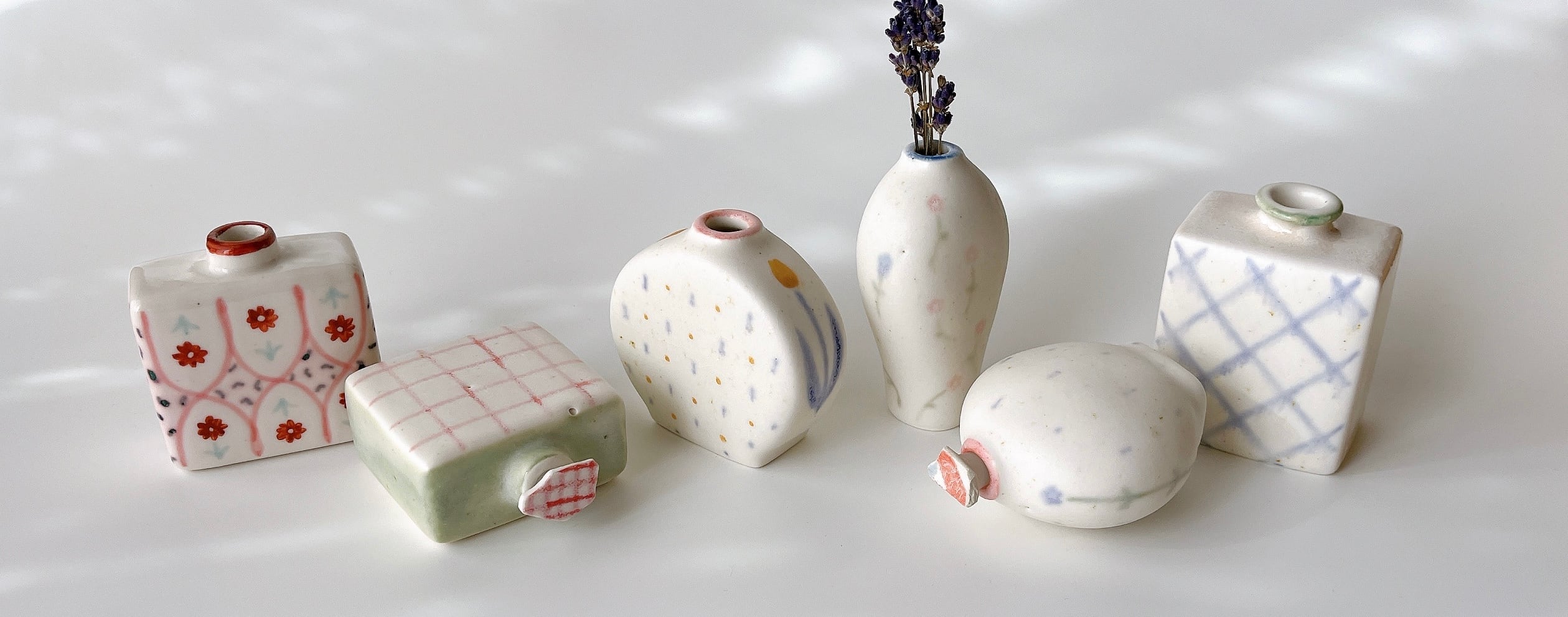 岐阜県多治見市で作陶されている北原祥平さんの作品は 優しさとユーモアがたっぷりつまっていて、 眺めているだけであなたの心をゆるっとほぐしてくれます。 あわく愉しい世界をお楽しみください♪ ・・・・・・・・・・・・・・・・・ 髪がぐるっと持ち手になった可愛らしいオブジェ。 お花を飾れば花かんむりをした女の子みたいにもなって楽しいの。 Aの子はお顔の上半分がつやっとしていて不思議な可愛さがあります。 Bはマットな質感。 「どんな考え事をしているのかな~?」なんて想像したくなる表情も良いです。 お気に入りのコーナーに飾ってチラチラ眺めたくなっちゃうよ。 ・・・・・・・・・・・・・・・・・ 素材:陶器 サイズ:約 高さ×横×奥行cm A 12×6.7×5.7cm B 12×7.3×6.1cm *1点ずつ手作業の為、形やサイズ・模様・釉薬の流れ・色ムラなど個体差がございます。 歪みや線(作成時の乾燥等による生じる小さなものなど)・黒点・ピンホール・小さな突起や釉薬ムラ等、陶作品の味わいとしてお楽しみ下さい。 われものの為、お取り扱いにはご注意下さいませ。 *実物の色味に近づけて撮影していますが、当日の天候・お使いのモニターによって若干の違いが見られる場合がございます、ご了承下さい。 ----北原祥平---- 奈良県出身。岐阜県多治見市在住。 手捻りやろくろ、石膏型など様々な技法を使い作陶しています。 人や動物をモチーフにオブジェや器など色々作ります。 ・・・・・・・・・・・・・・・・・ 【発送方法について】 □ゆうパック・・・日時指定が可能です。ご希望のある場合は備考欄にご記入ください。 発送後にお知らせする伝票番号から、日本郵便のオンラインにて事前に到着日時の指定も可能です。