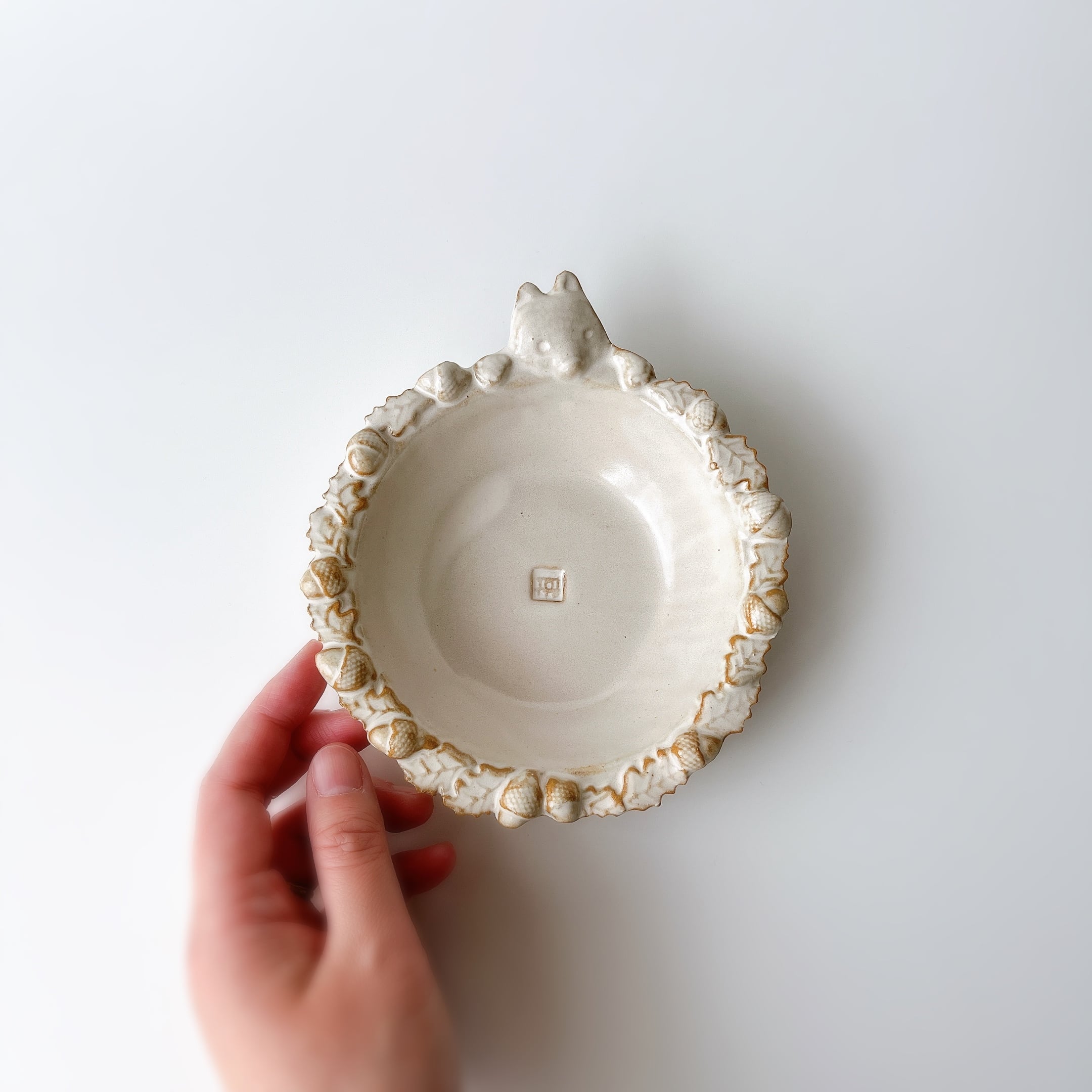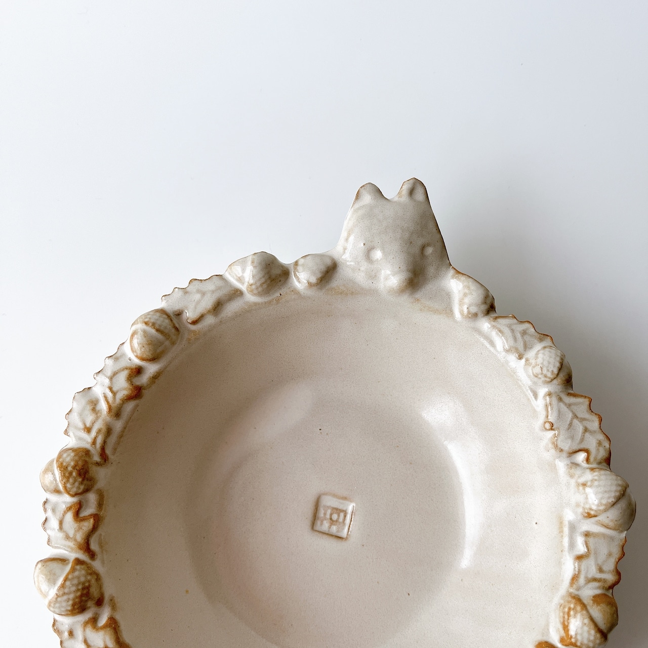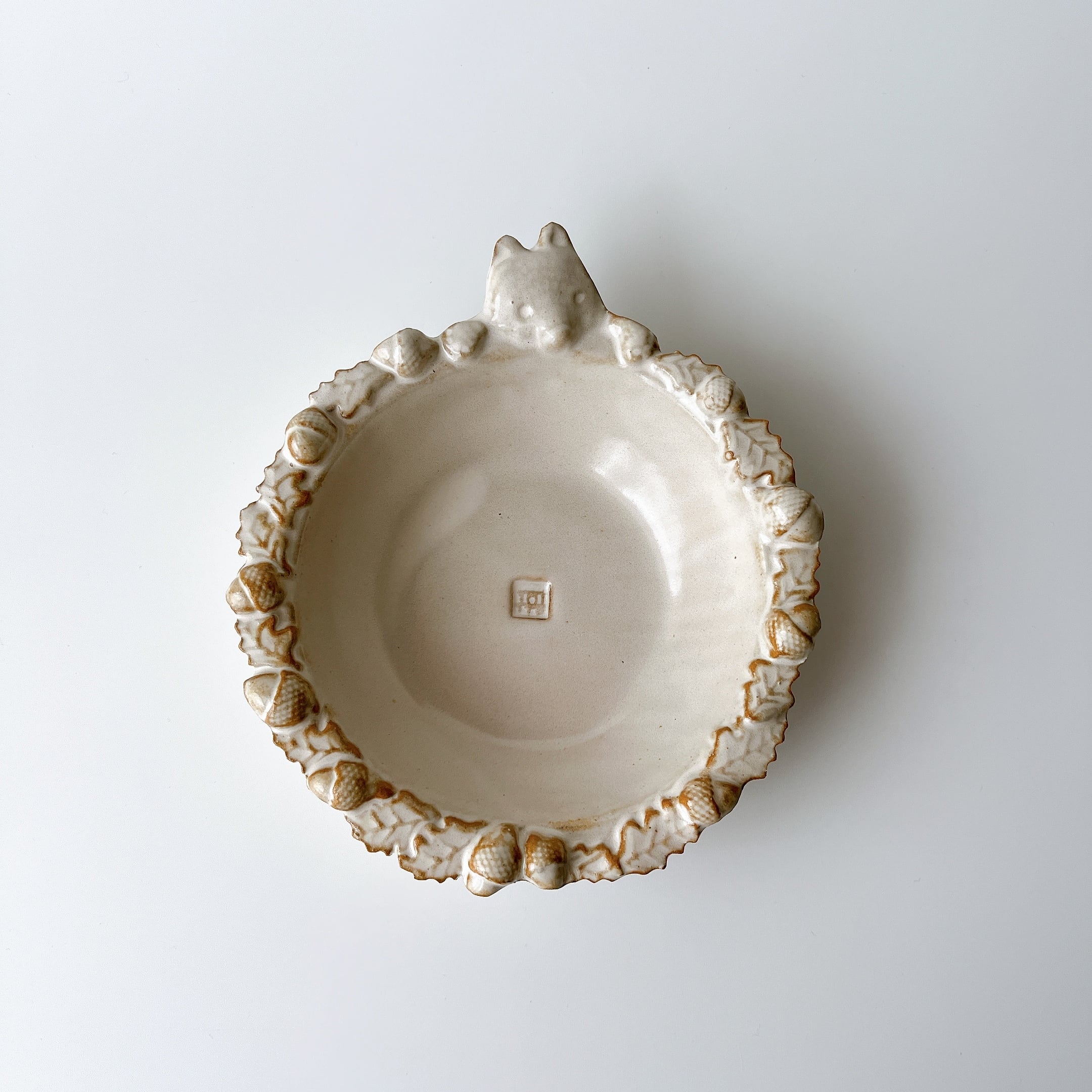 こぎつねがどんぐりで縁を飾った小鉢サイズのサラダボウル。