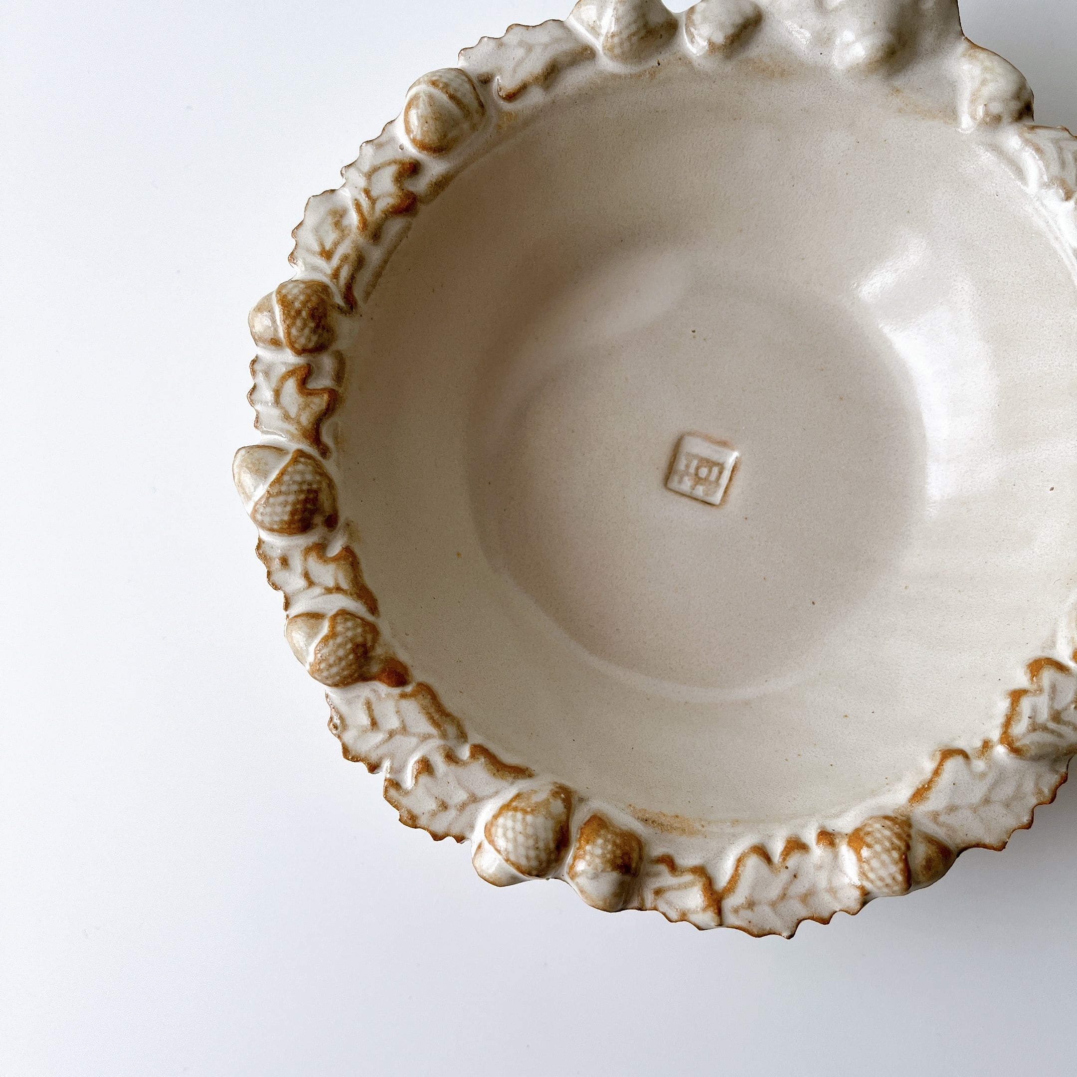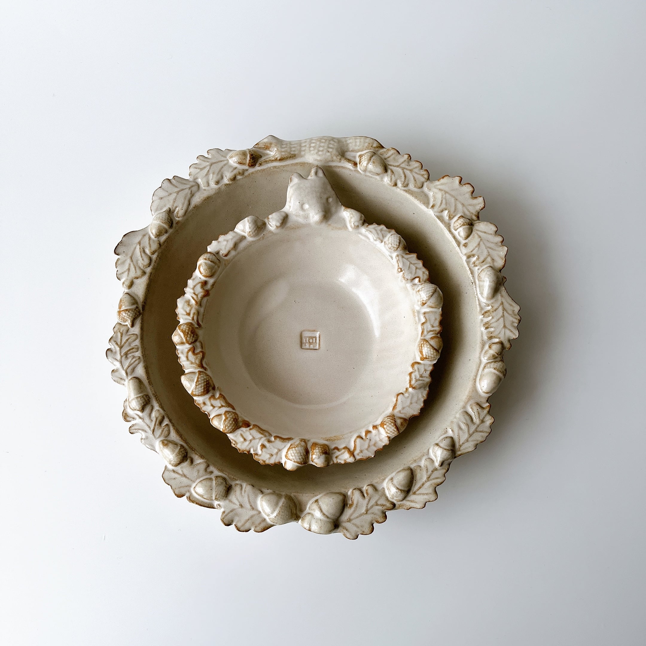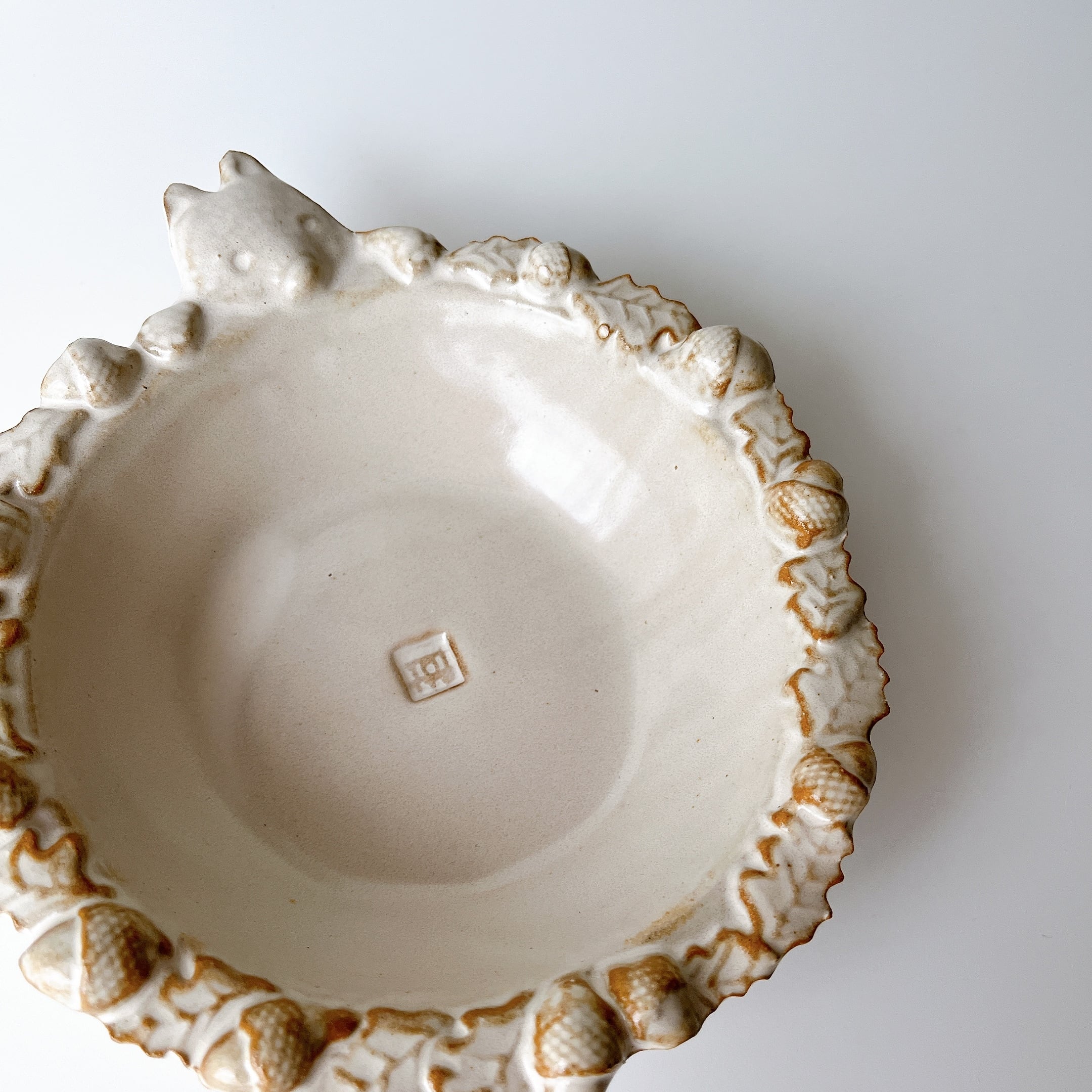 こぎつねがどんぐりで縁を飾った小鉢サイズのサラダボウル。