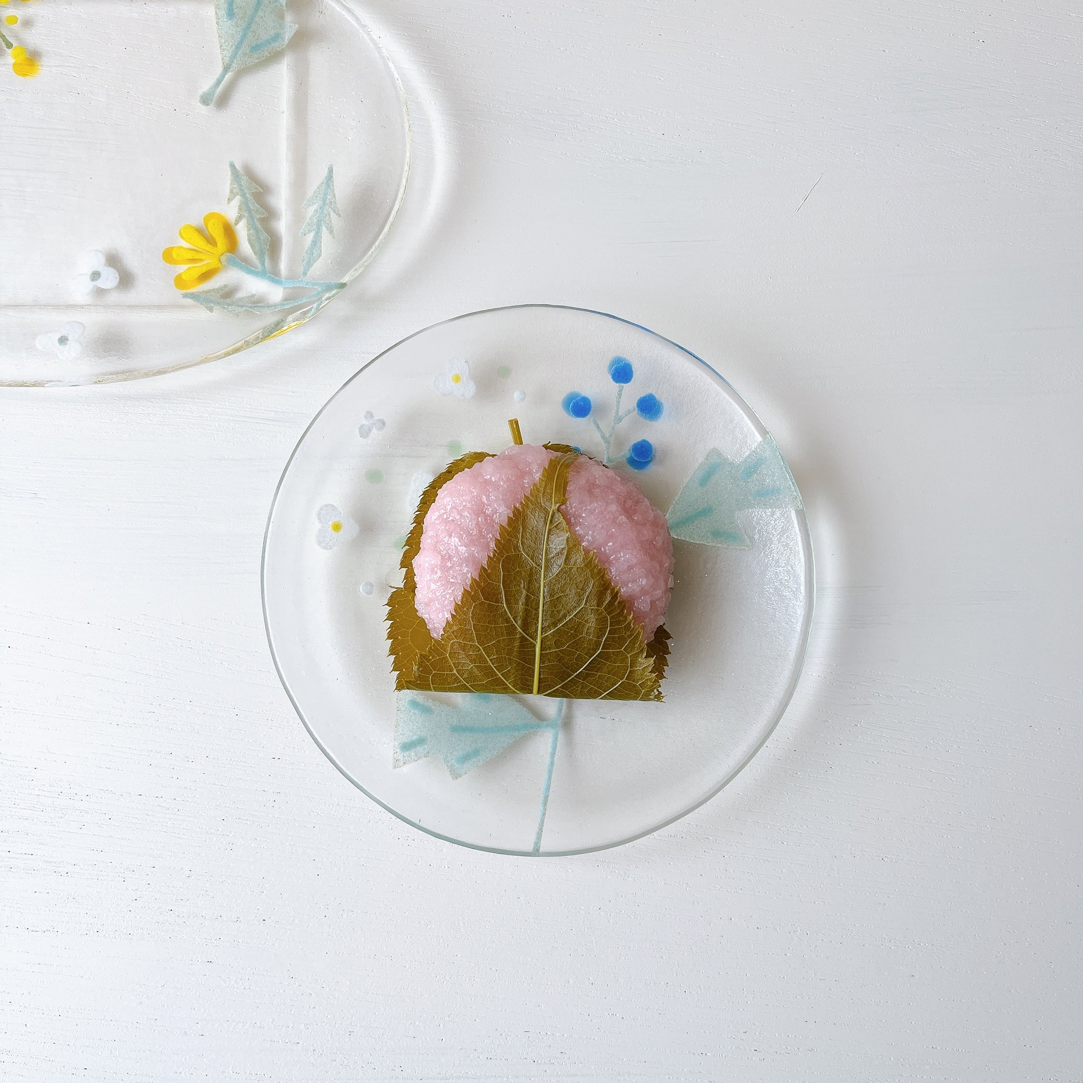 お花や葉っぱなどの植物が描かれた沖 知江子さんのガラスのプレート。