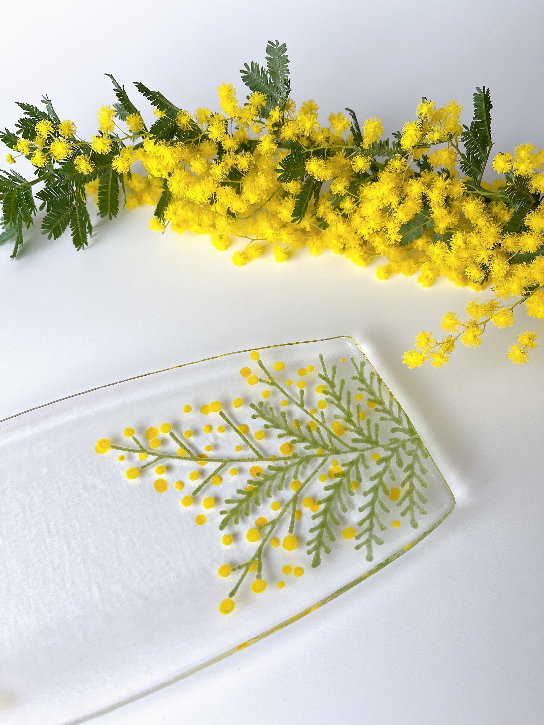 板ガラスを電気炉で焼成するフュージング・スランピングという技法を用いて1点ずつ丁寧に作られています。