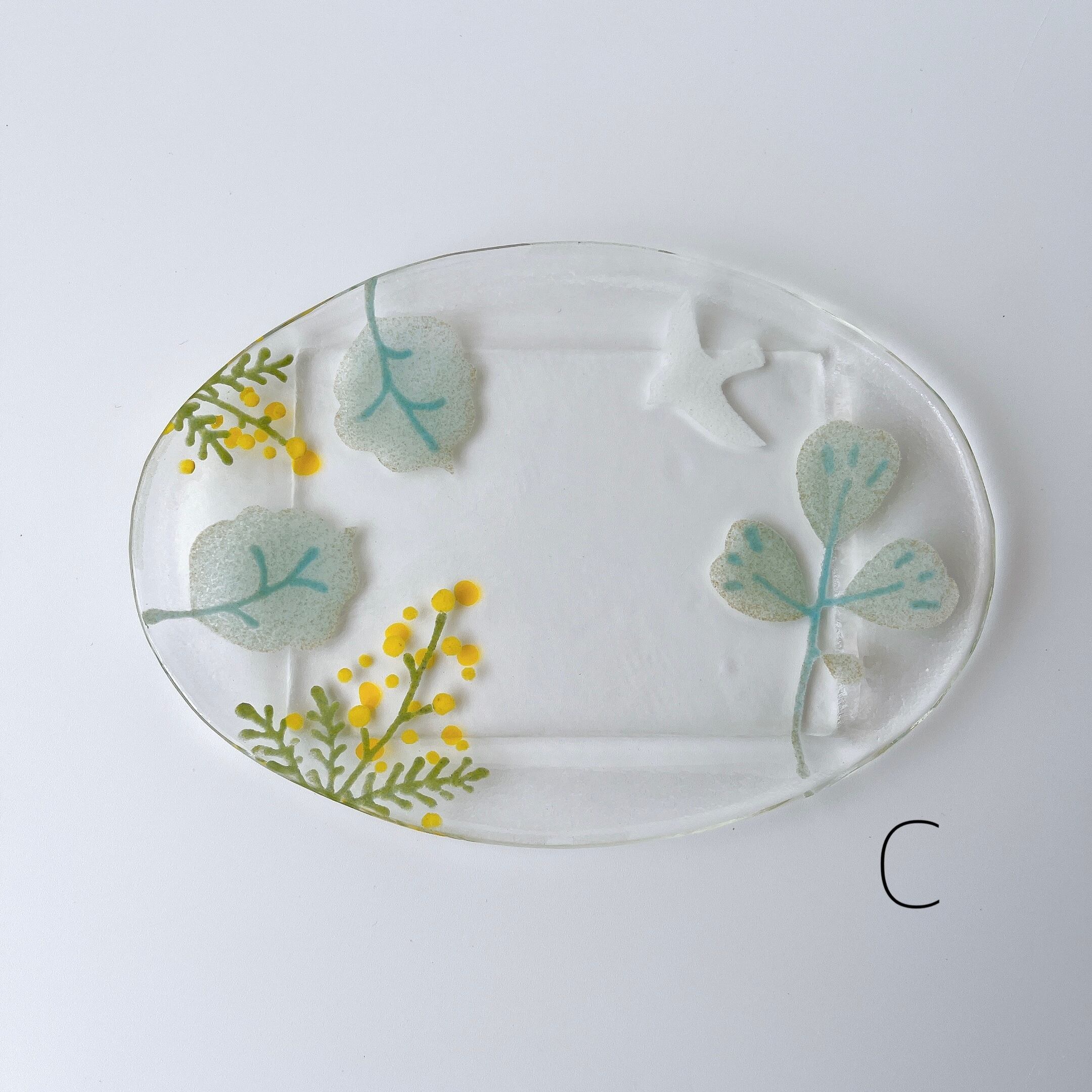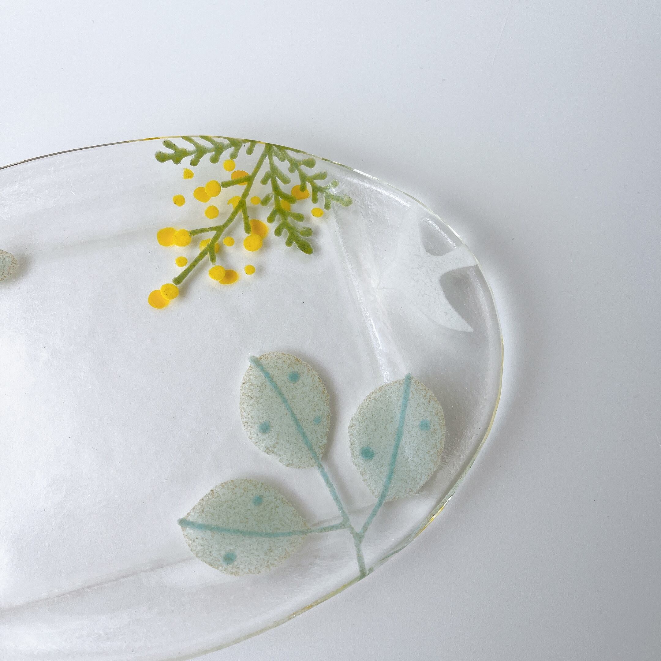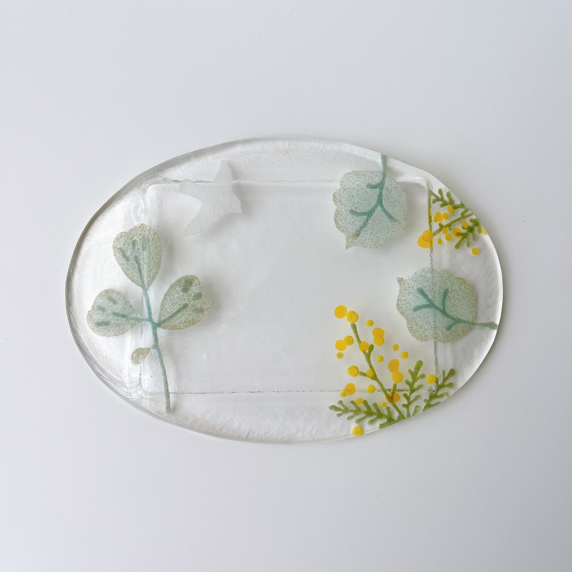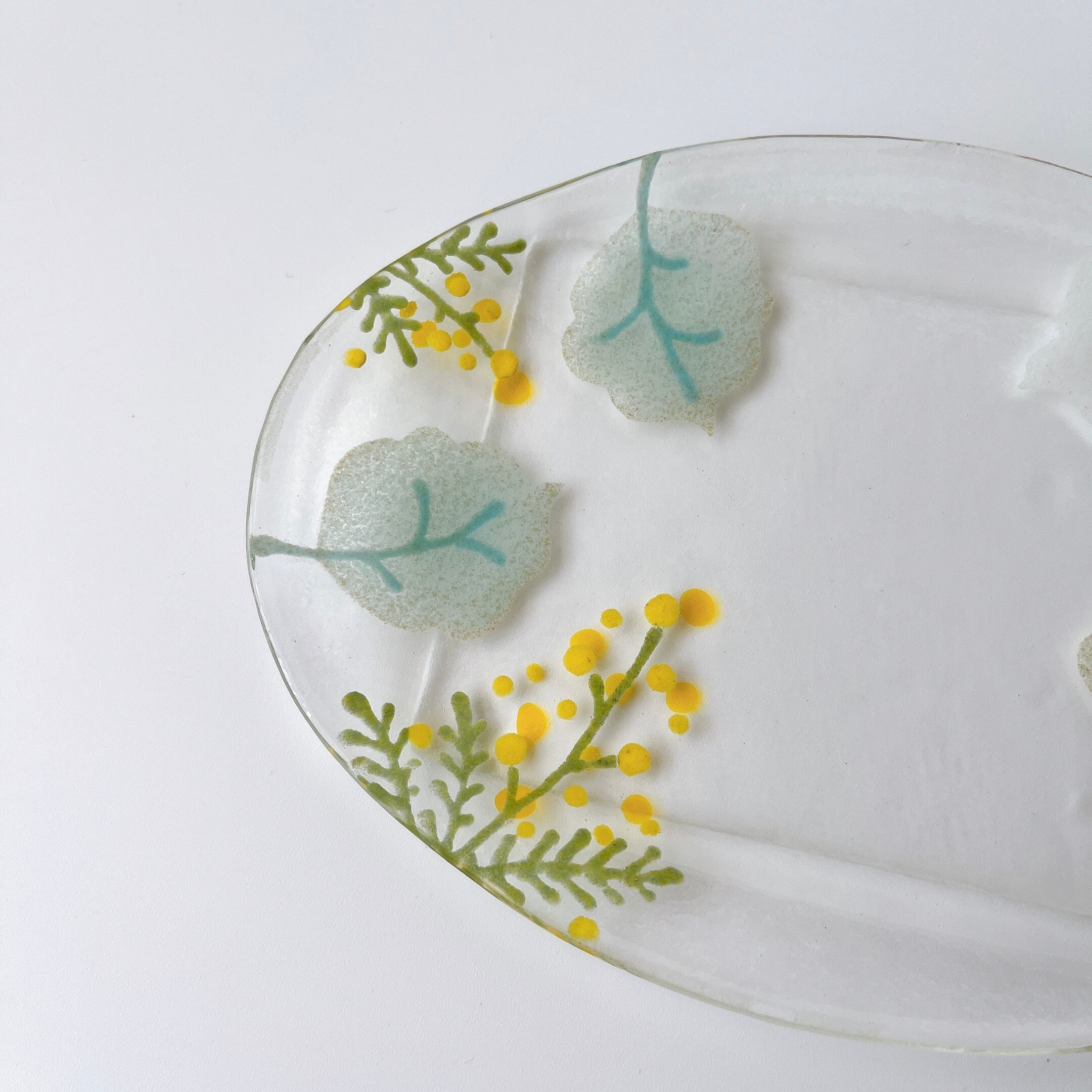 お花や葉っぱなどの植物が描かれた沖 知江子さんのガラスのプレート。