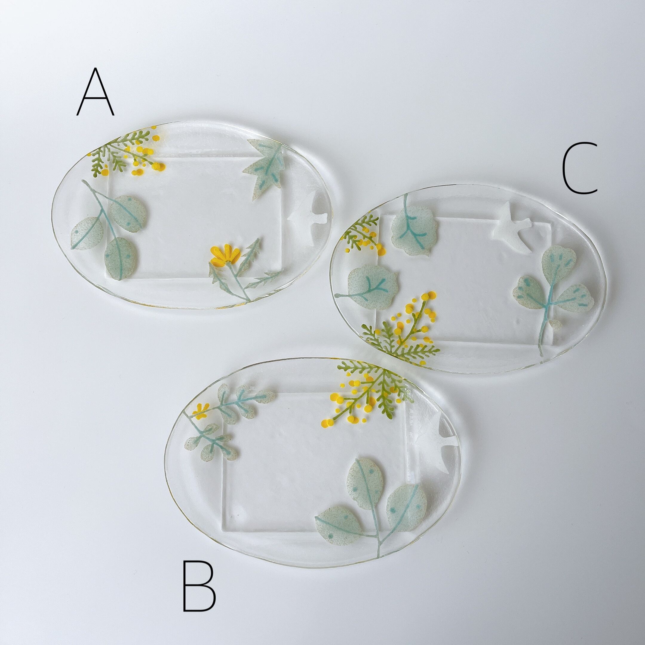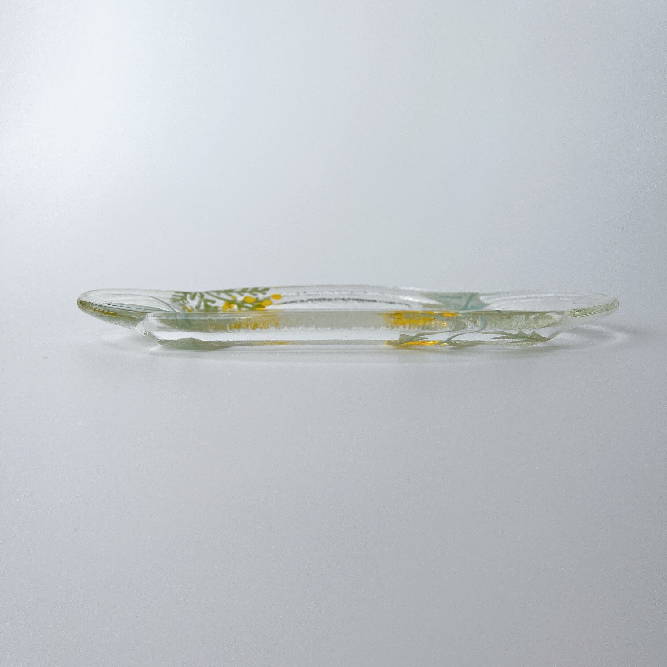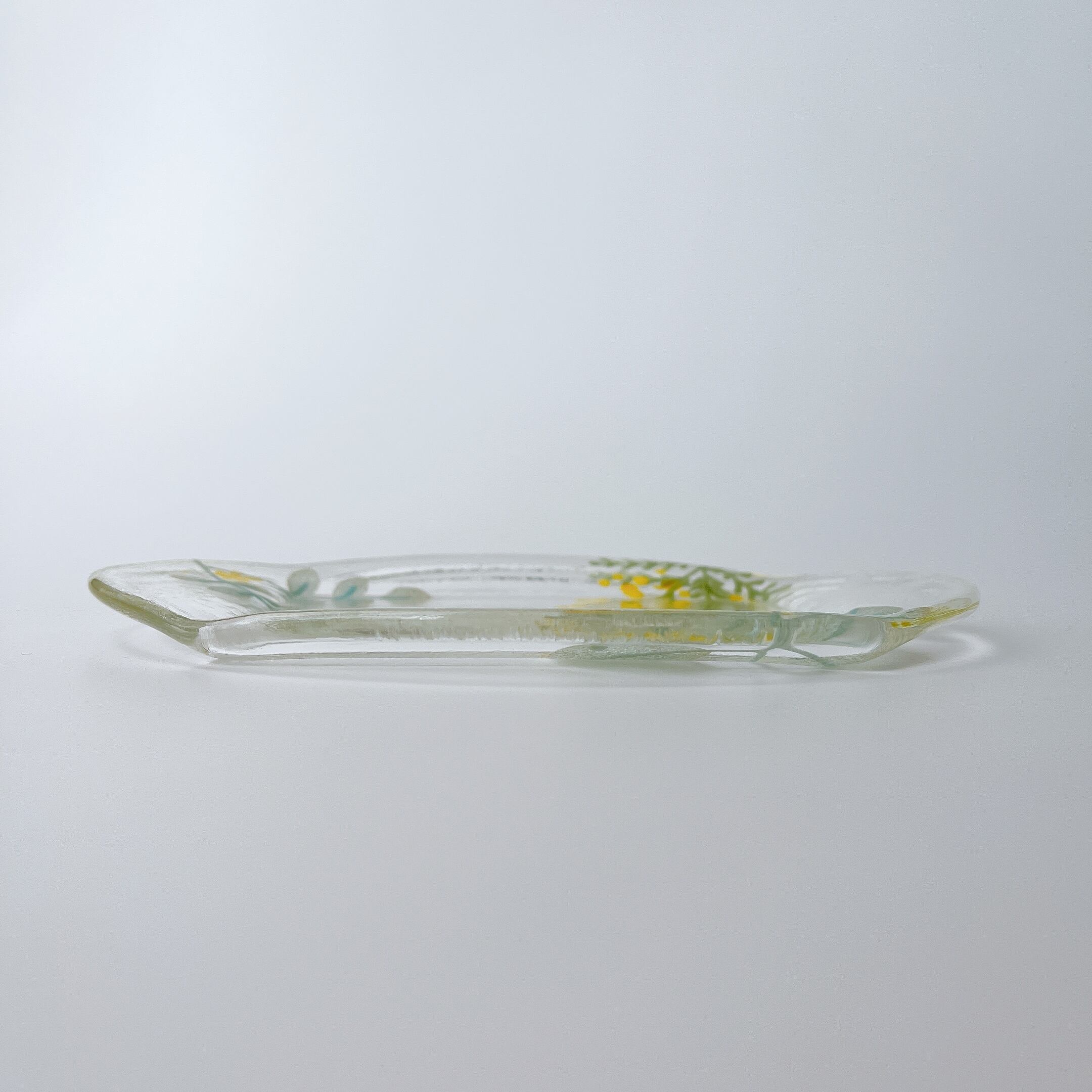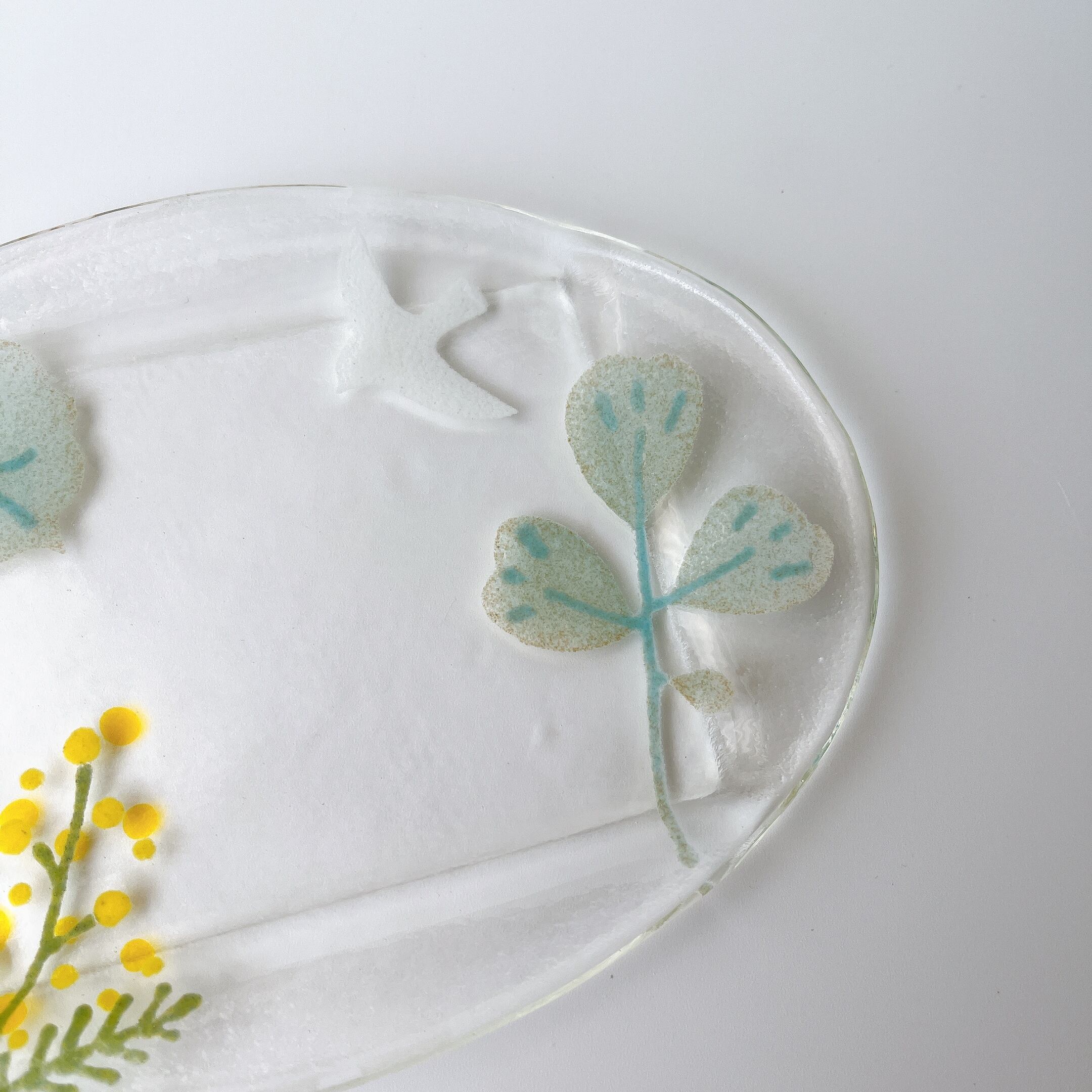 お花や葉っぱなどの植物が描かれた沖 知江子さんのガラスのプレート。