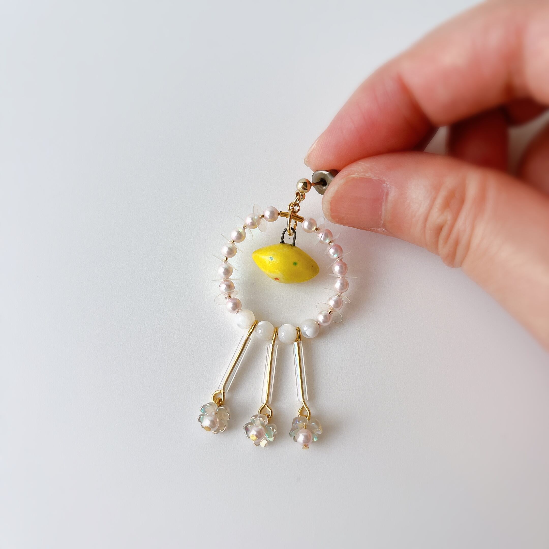ひとつひとつ、可愛くもユニークな陶モチーフ×ビーズなどいろんな素材を組み合わせて作られています。