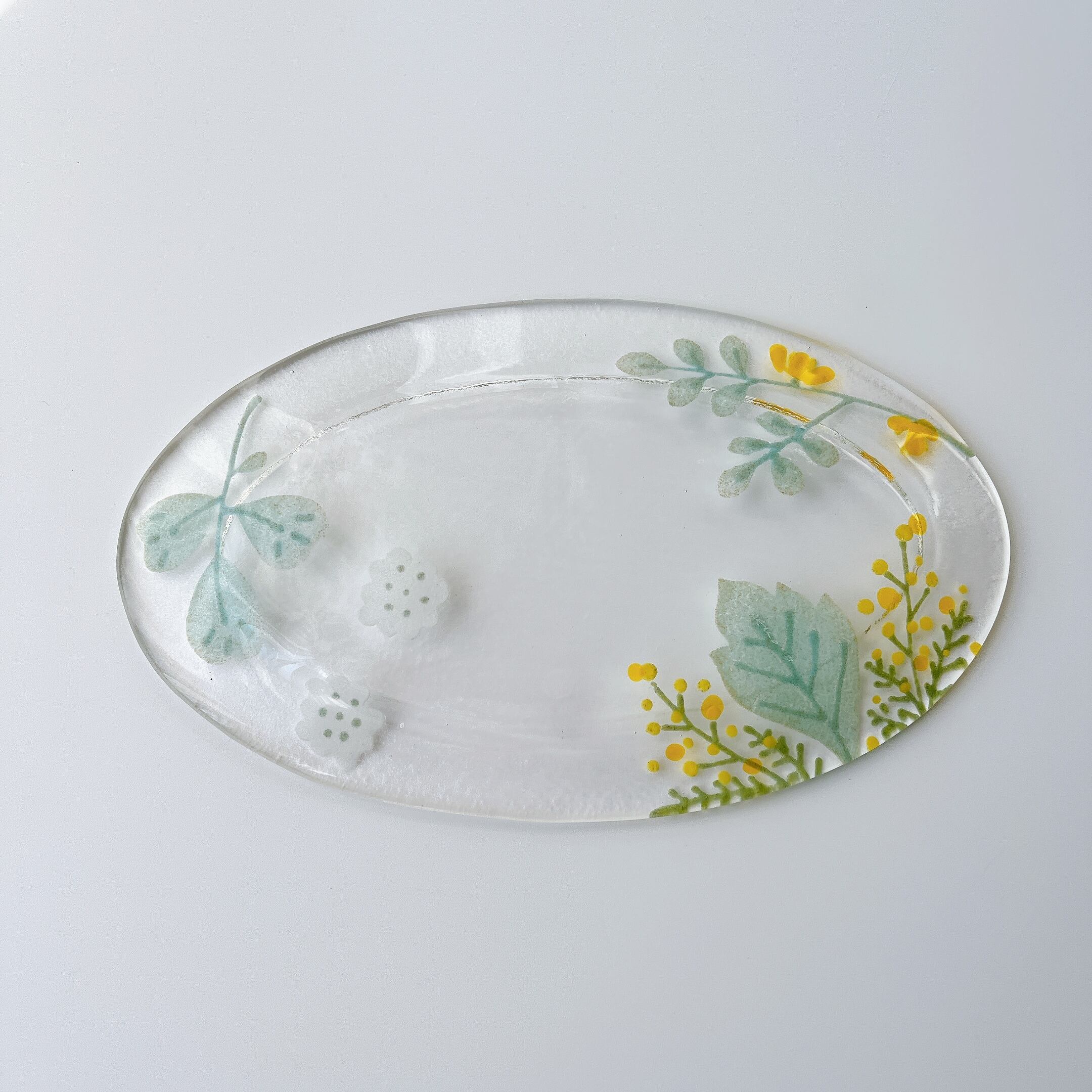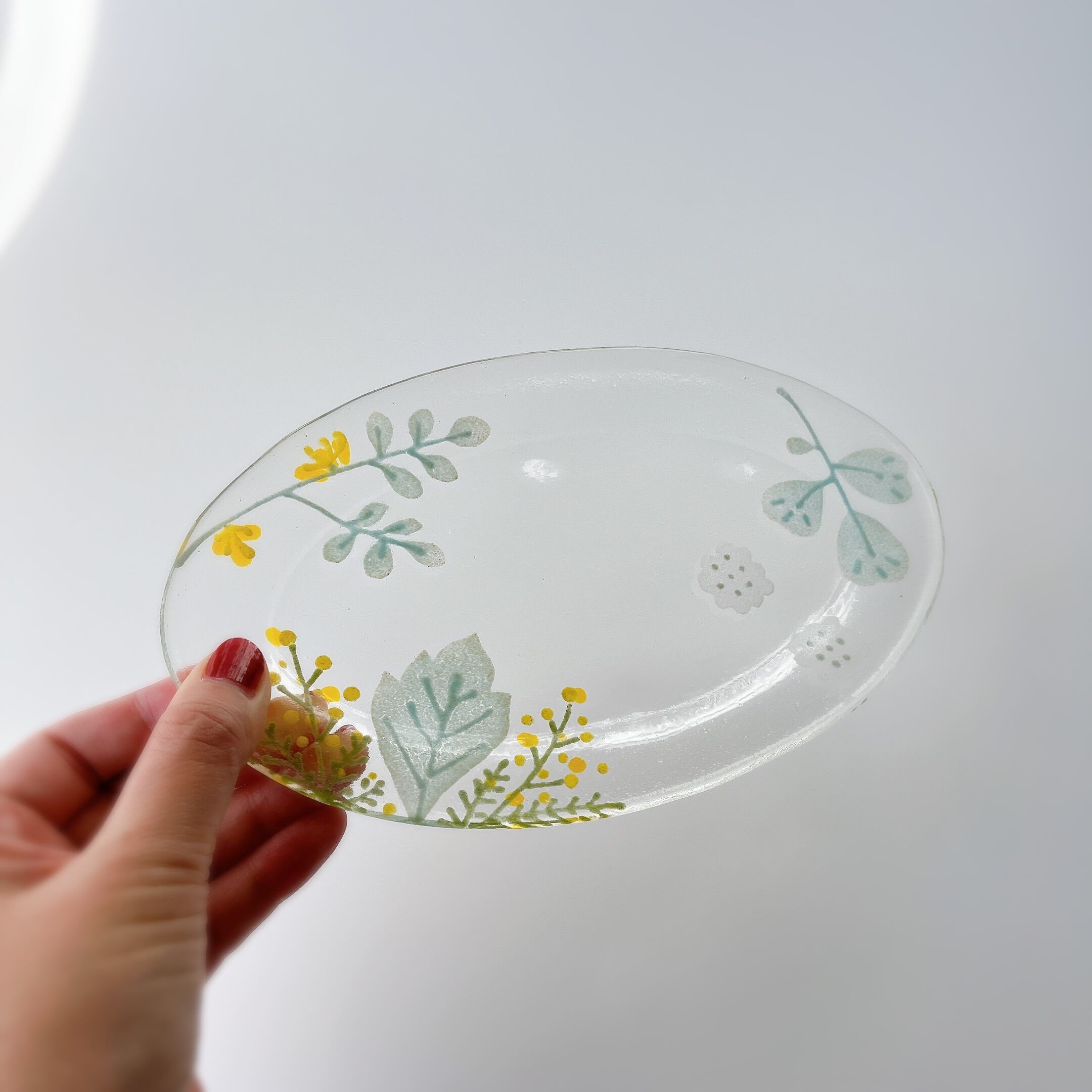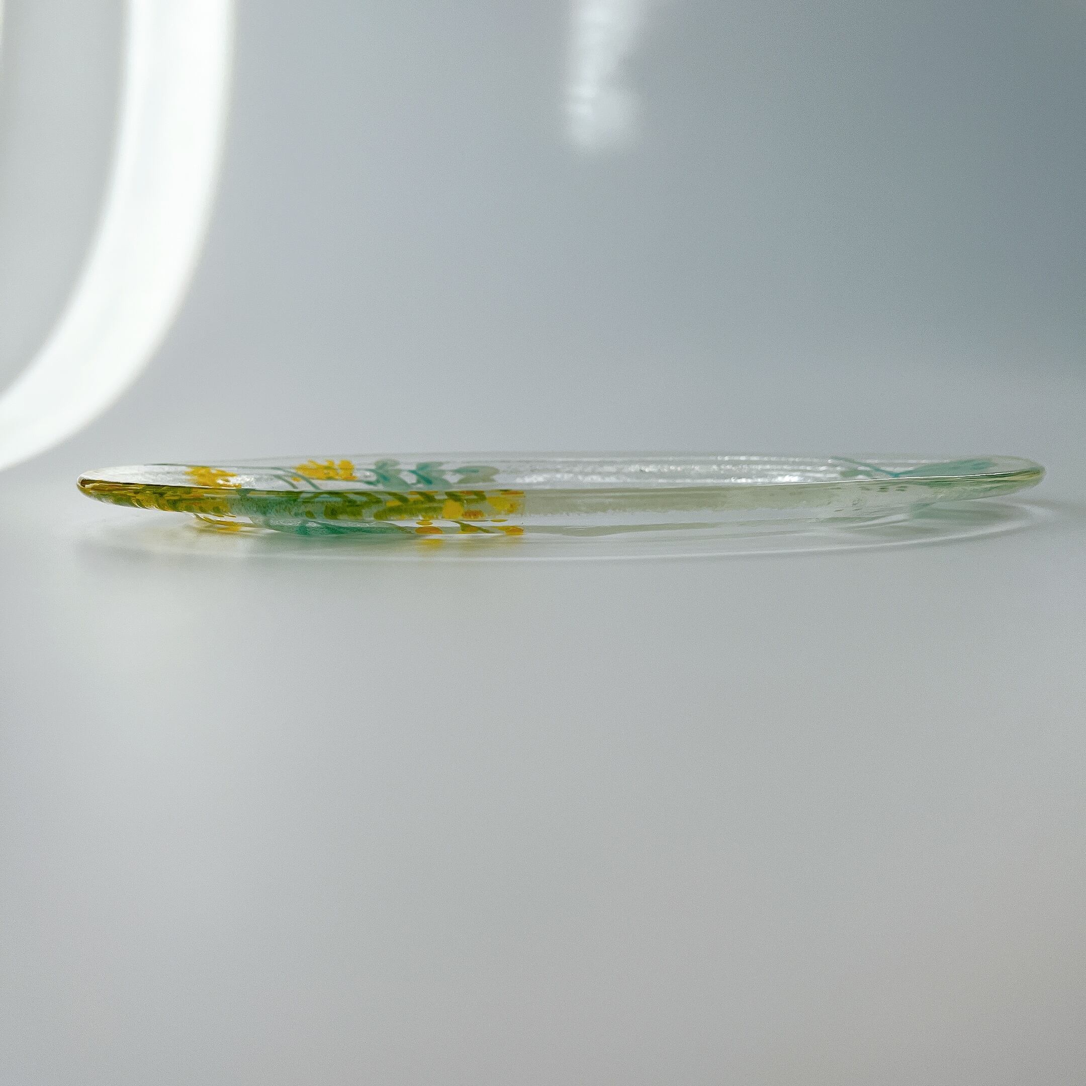 お花や葉っぱなどの植物が描かれた沖 知江子さんのガラスのプレート。