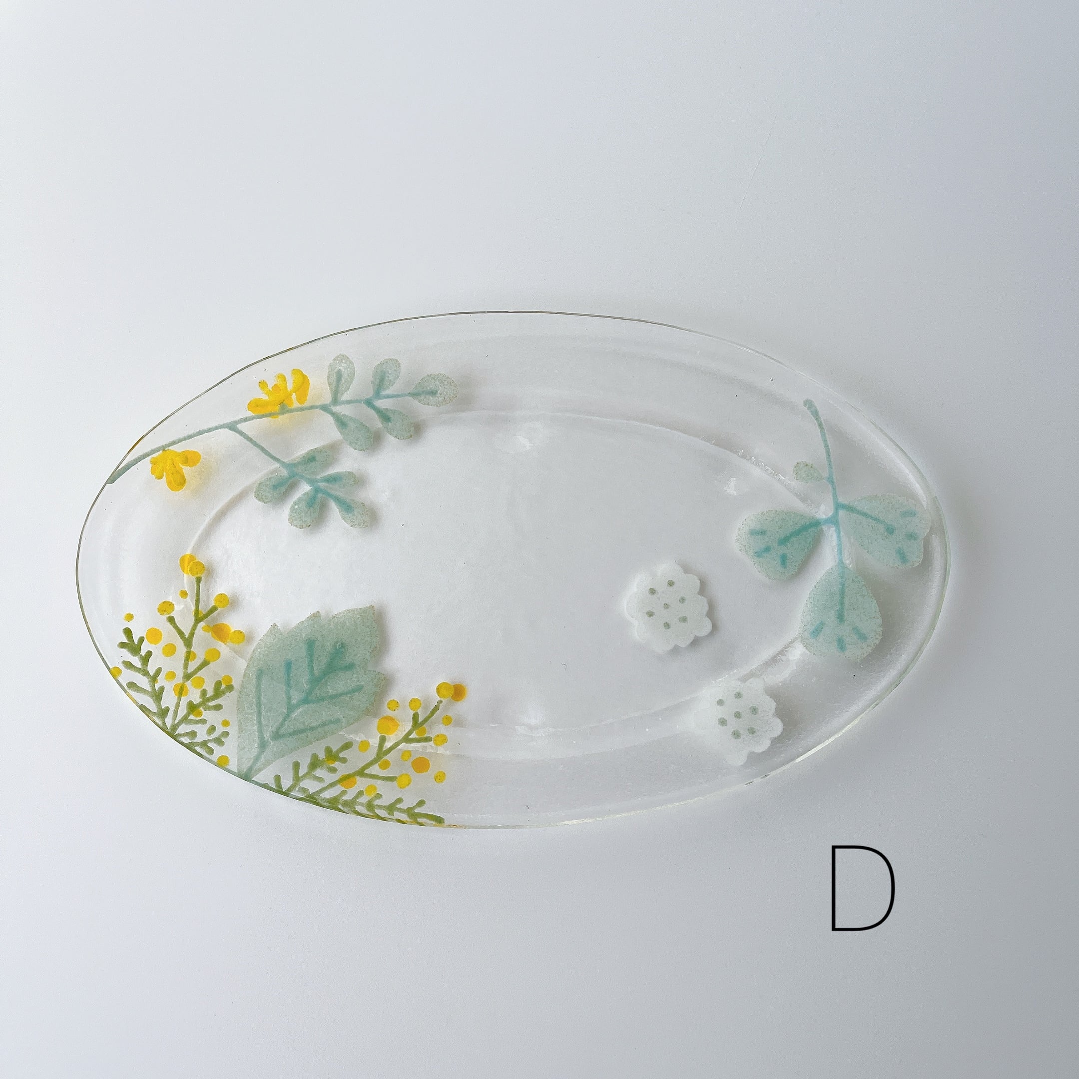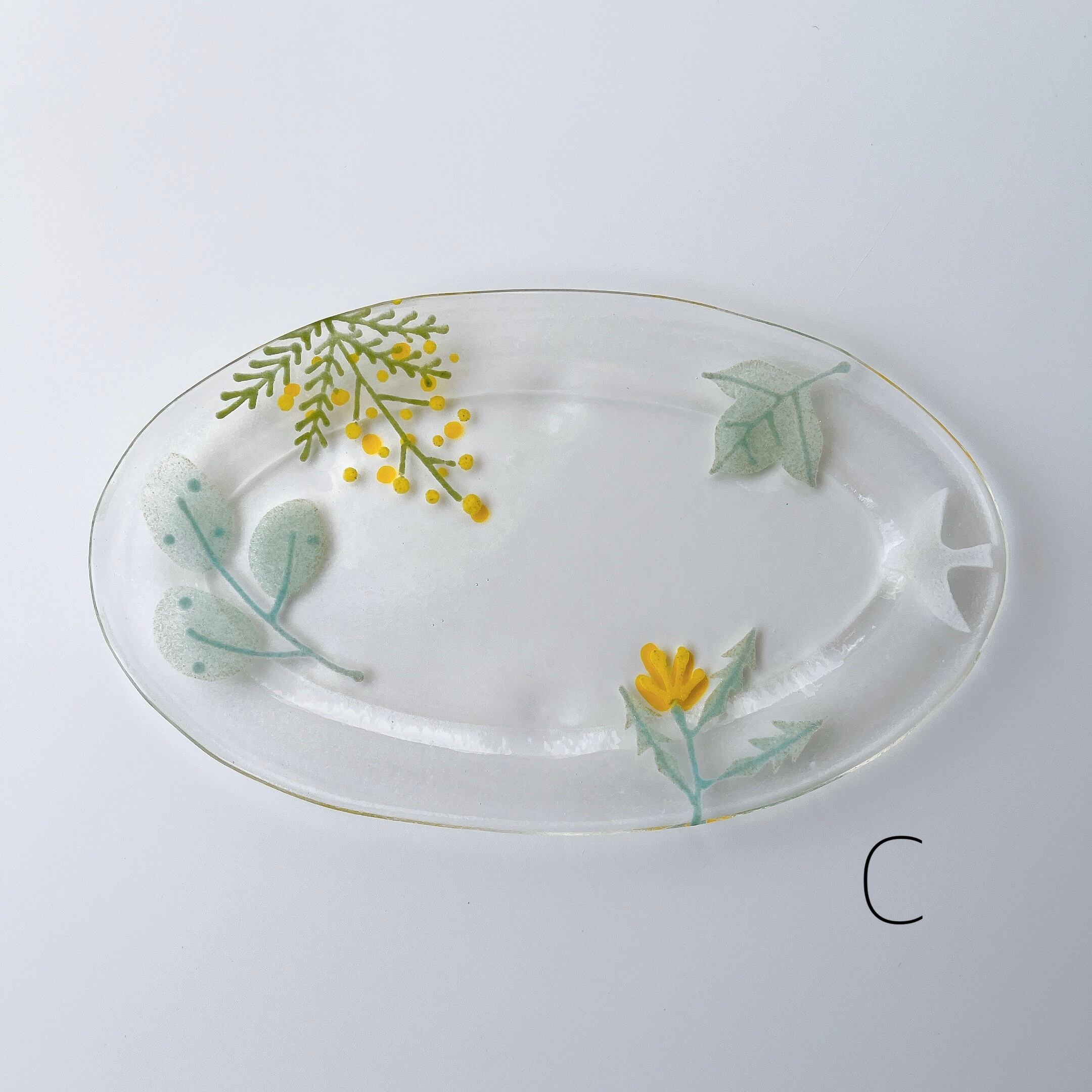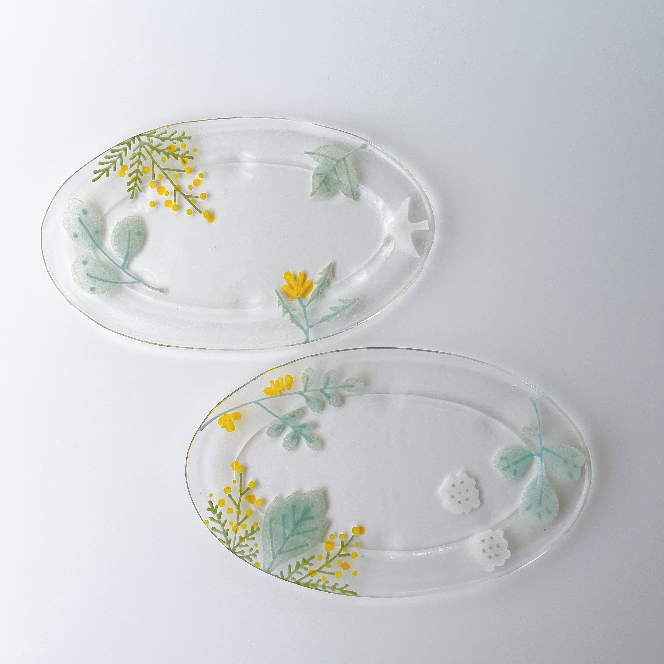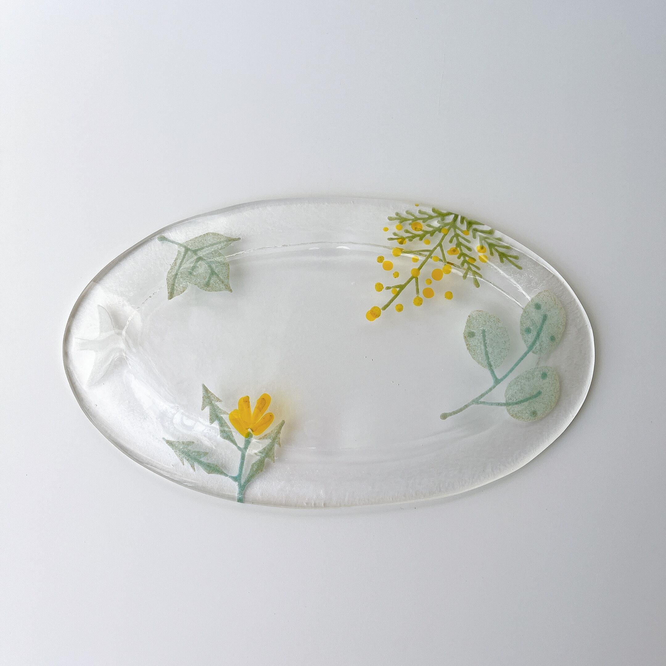 お花や葉っぱなどの植物が描かれた沖 知江子さんのガラスのプレート。