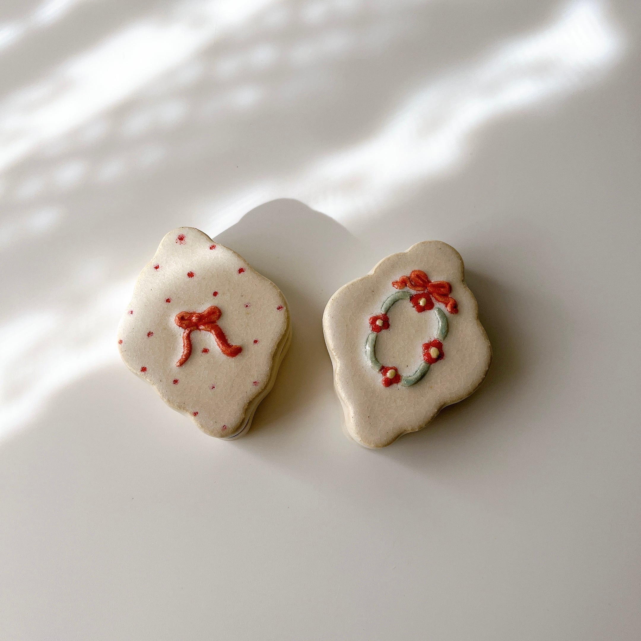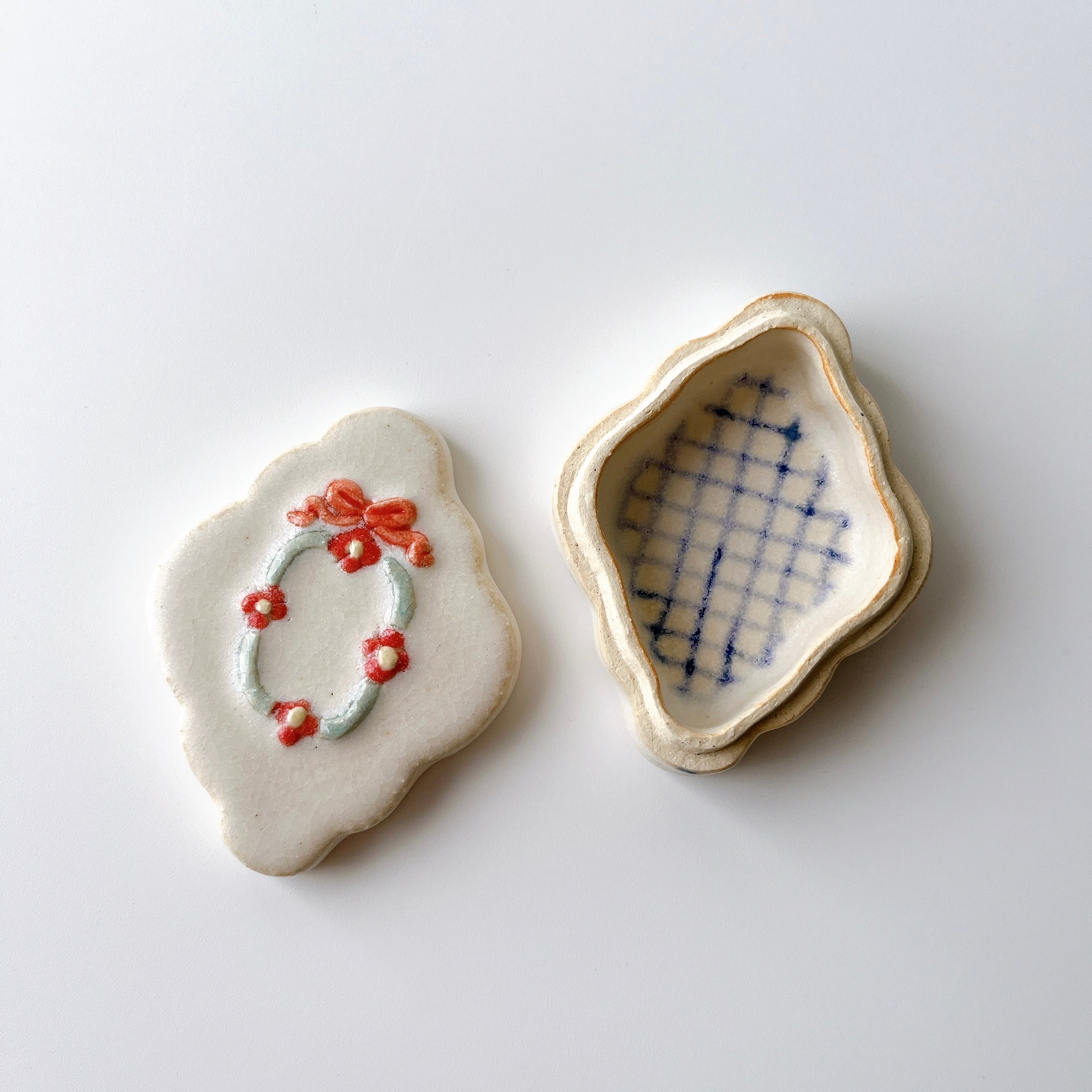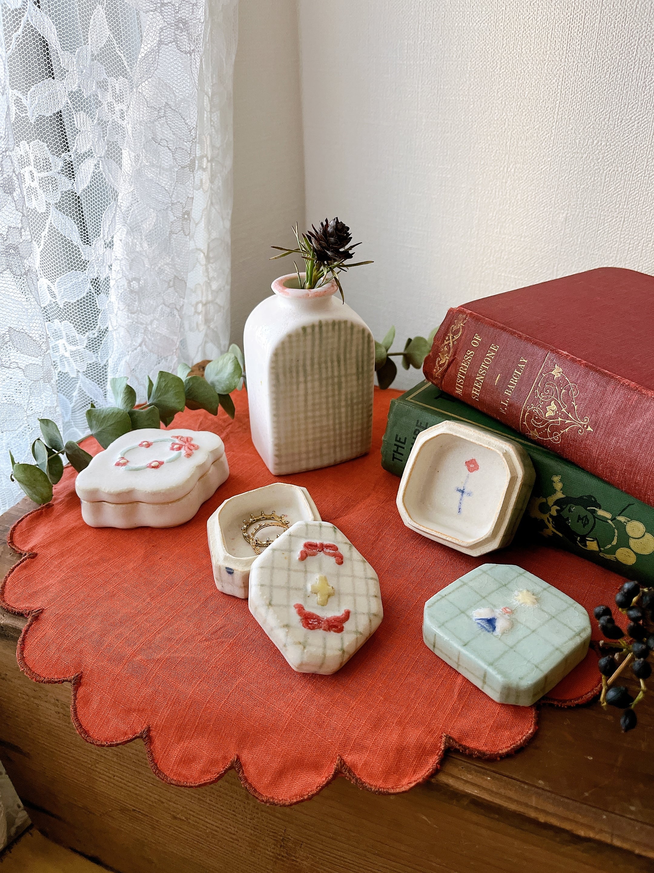 まるでヨーロッパのアンティークショップで見つけたような陶の小箱たち。