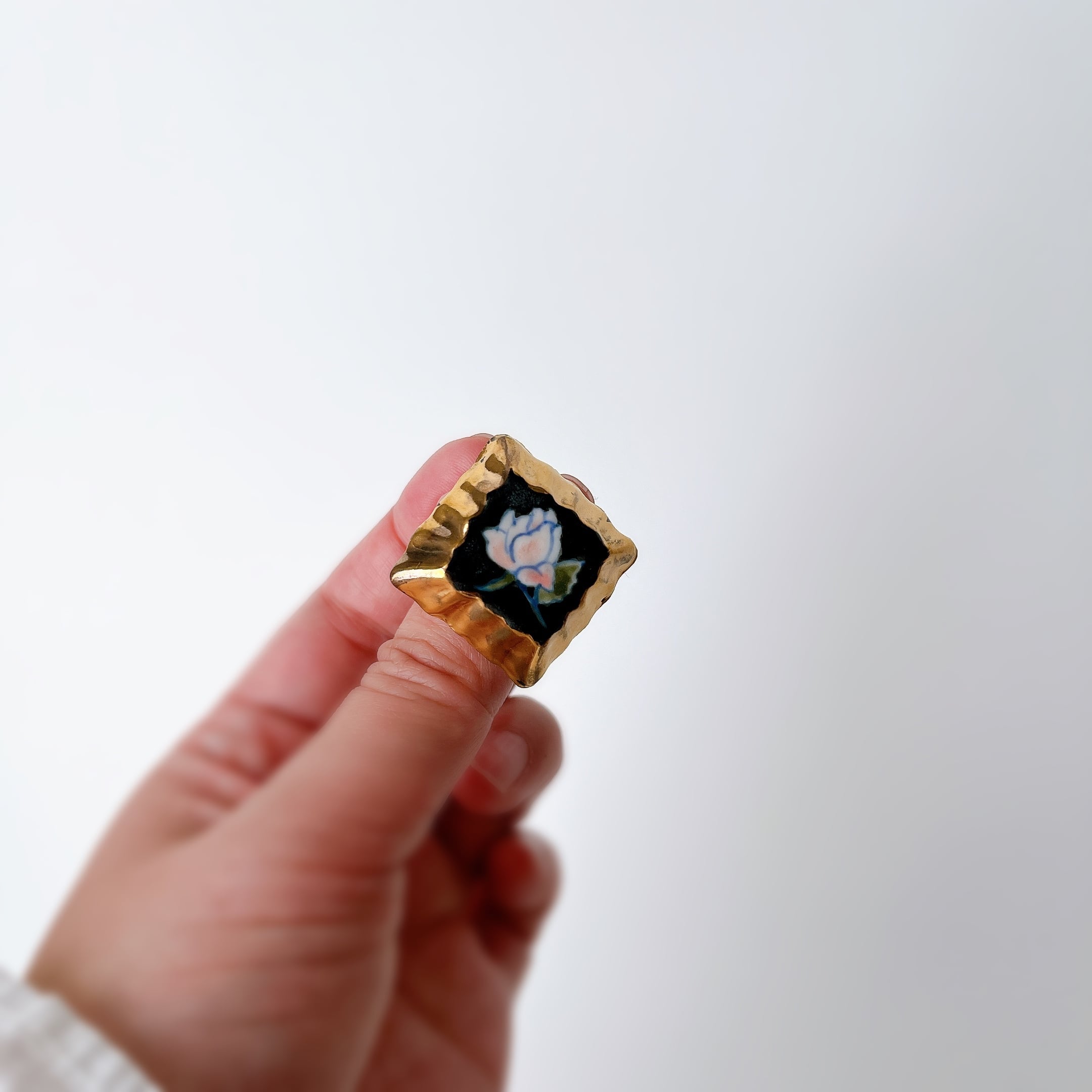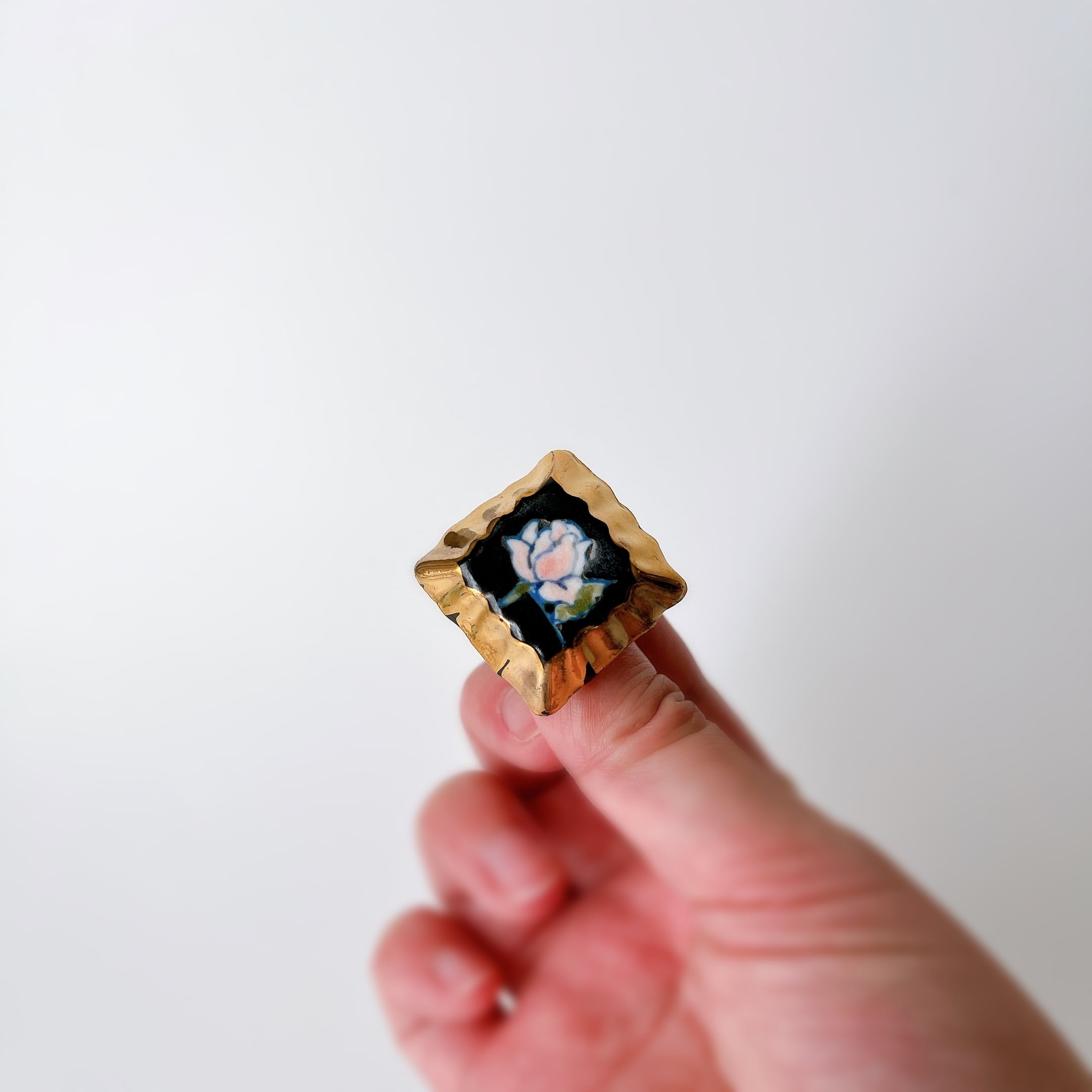 麗しい薔薇の柄はアーティストの手描きで温かみも感じます。ゴールドの輝きがまた高級感を演出してくれます。くすんだ色合いもアンティーク感増してとっても素敵。