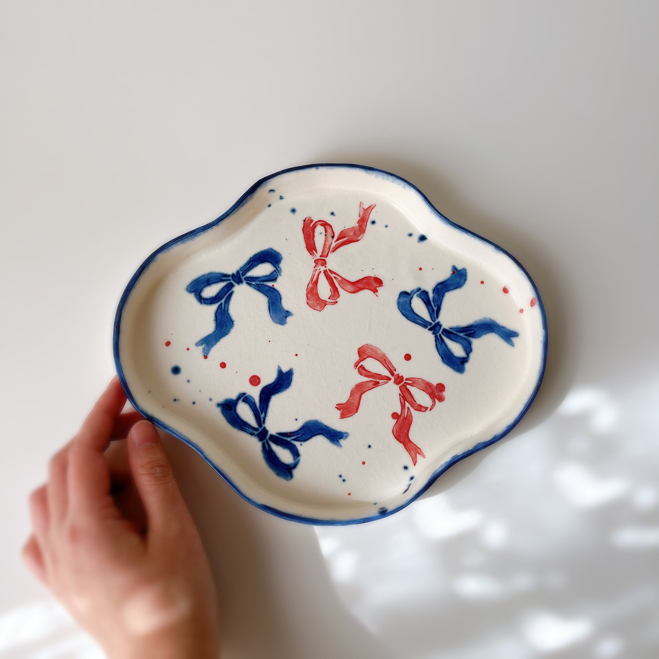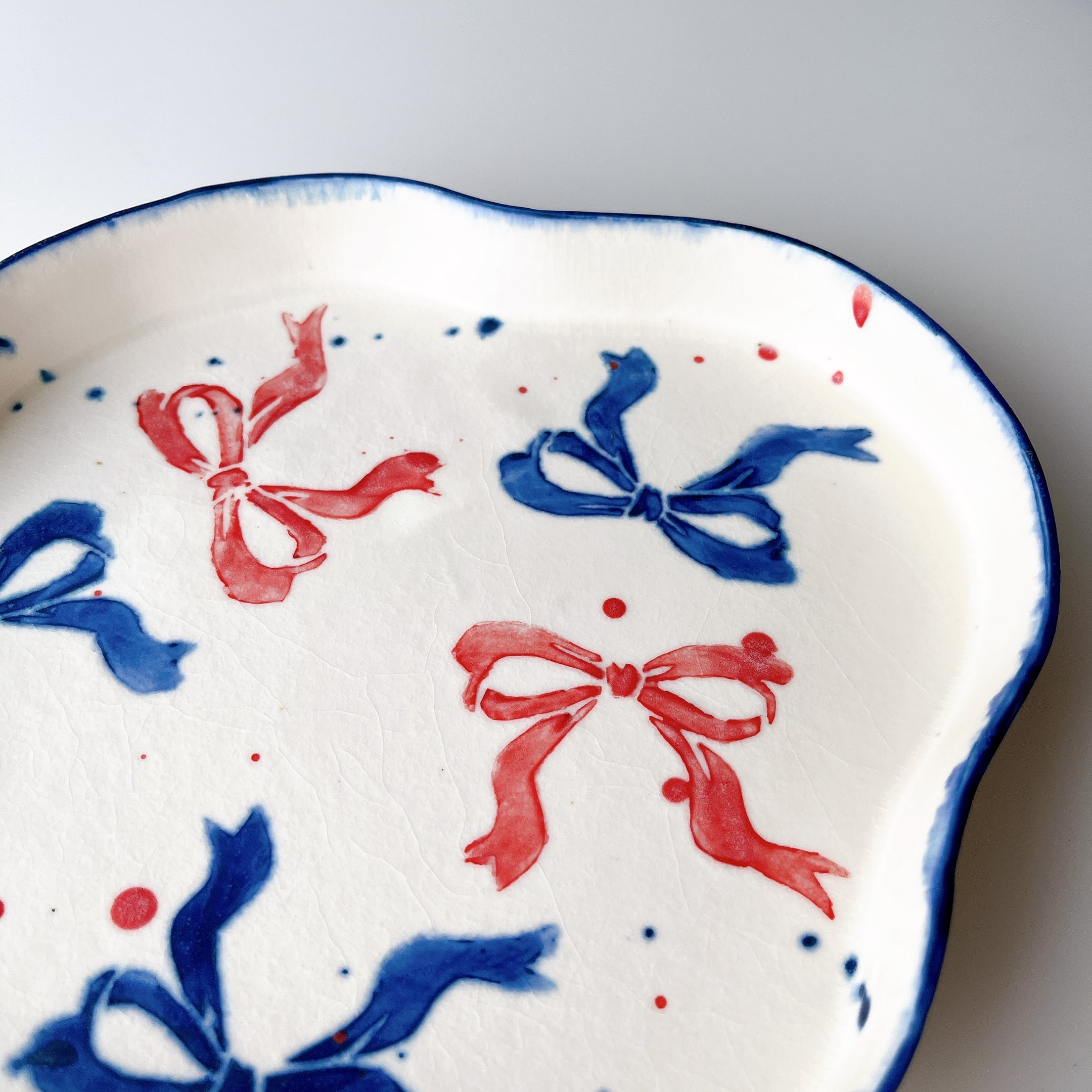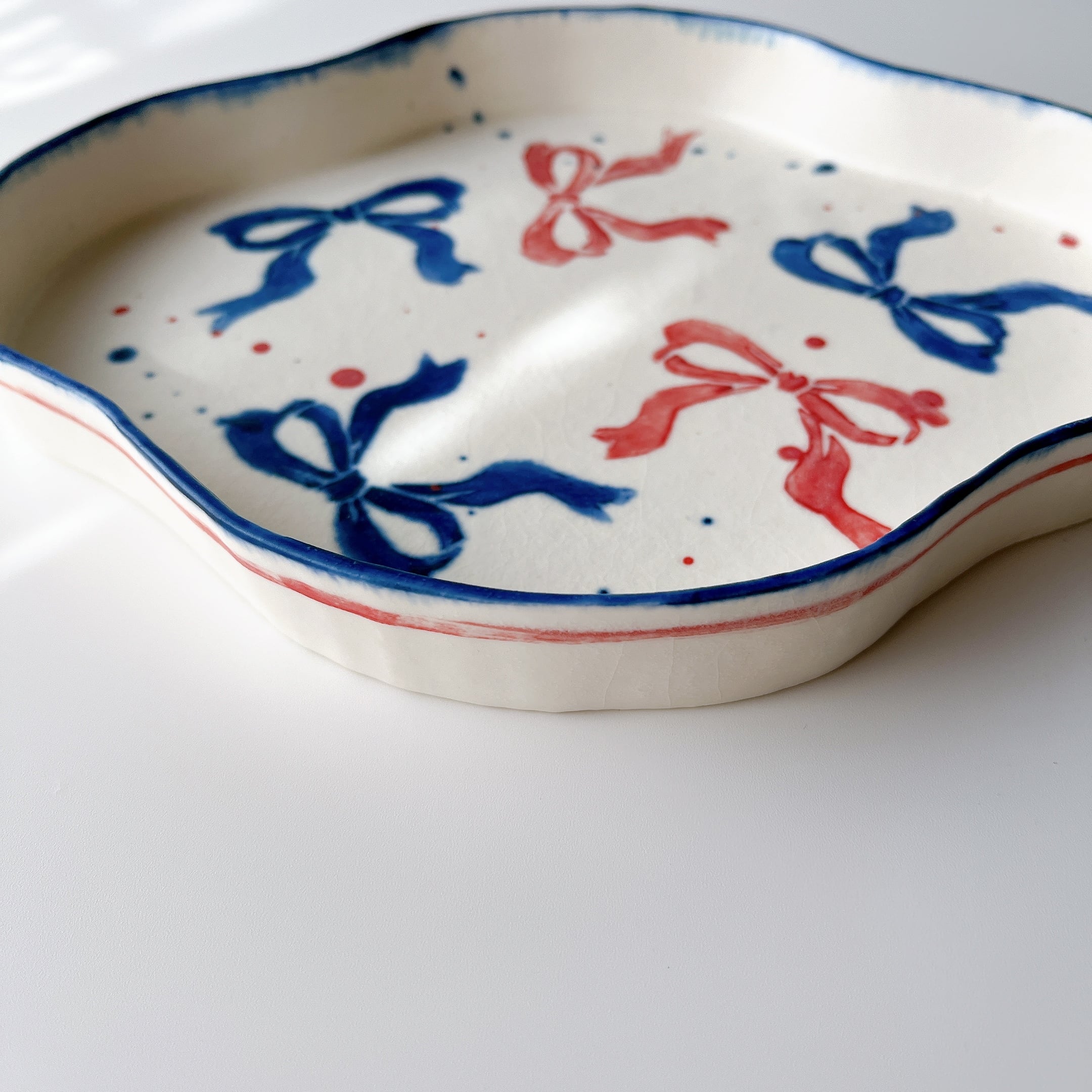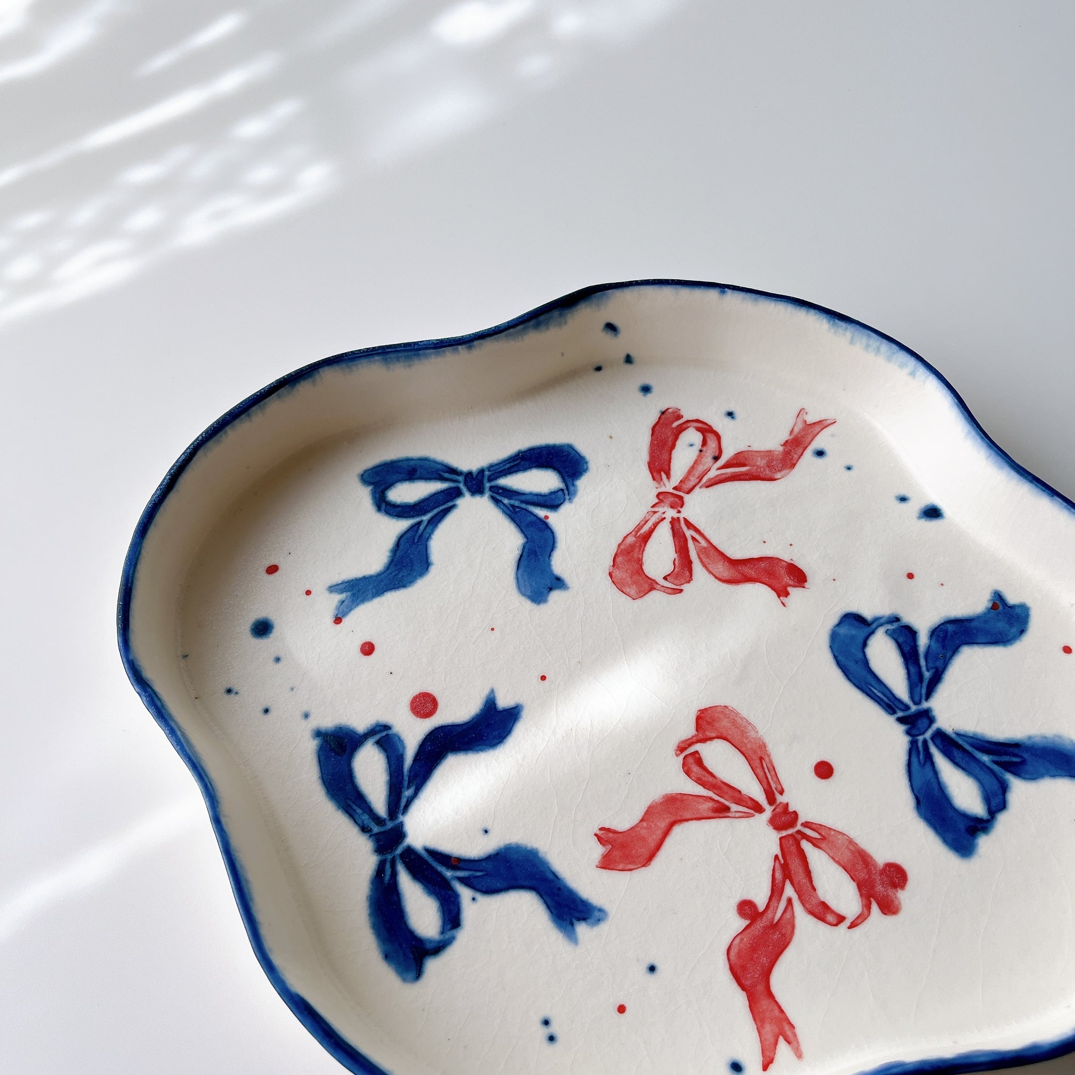 曲線が美しい、お花のような形のお皿に描かれた沢山のリボン。