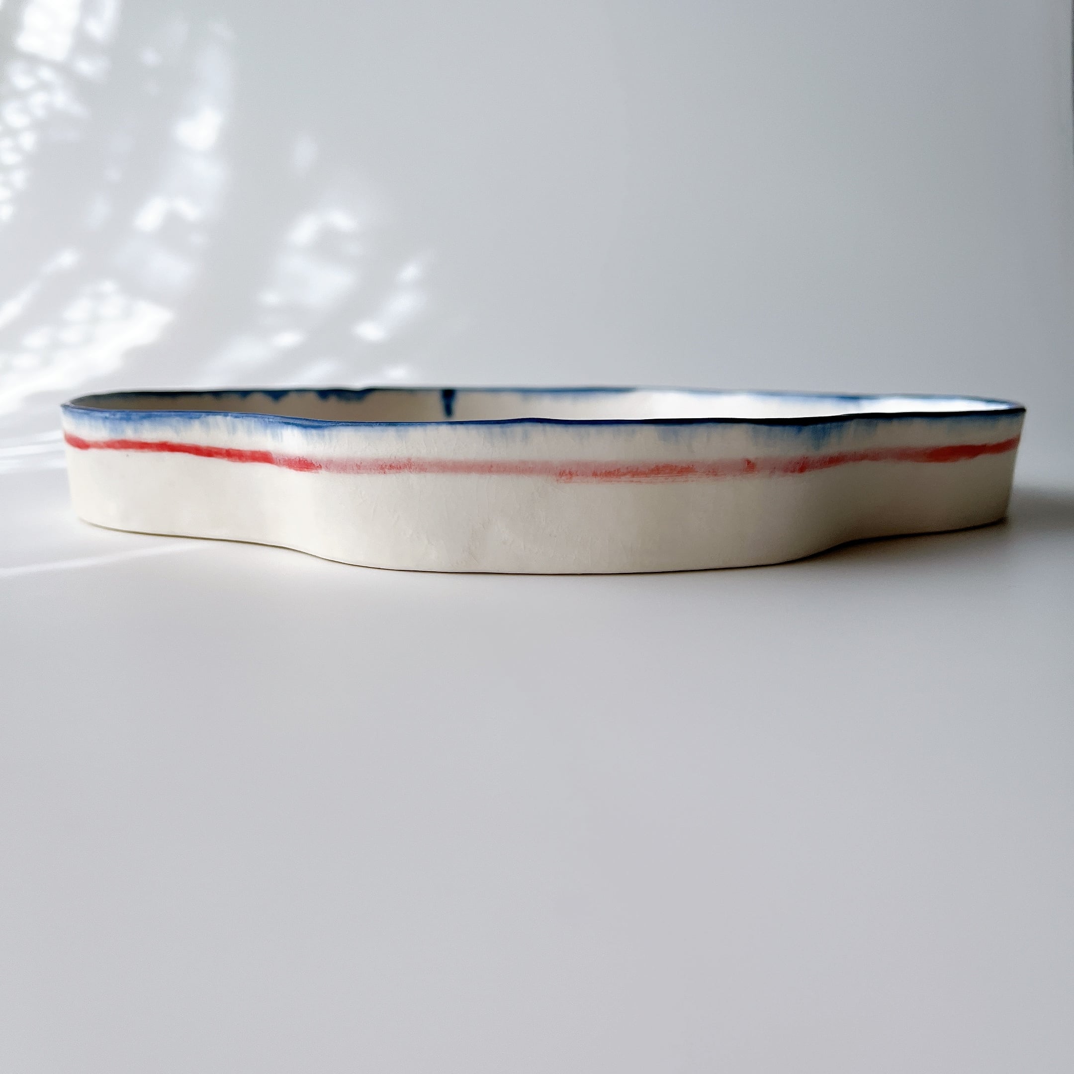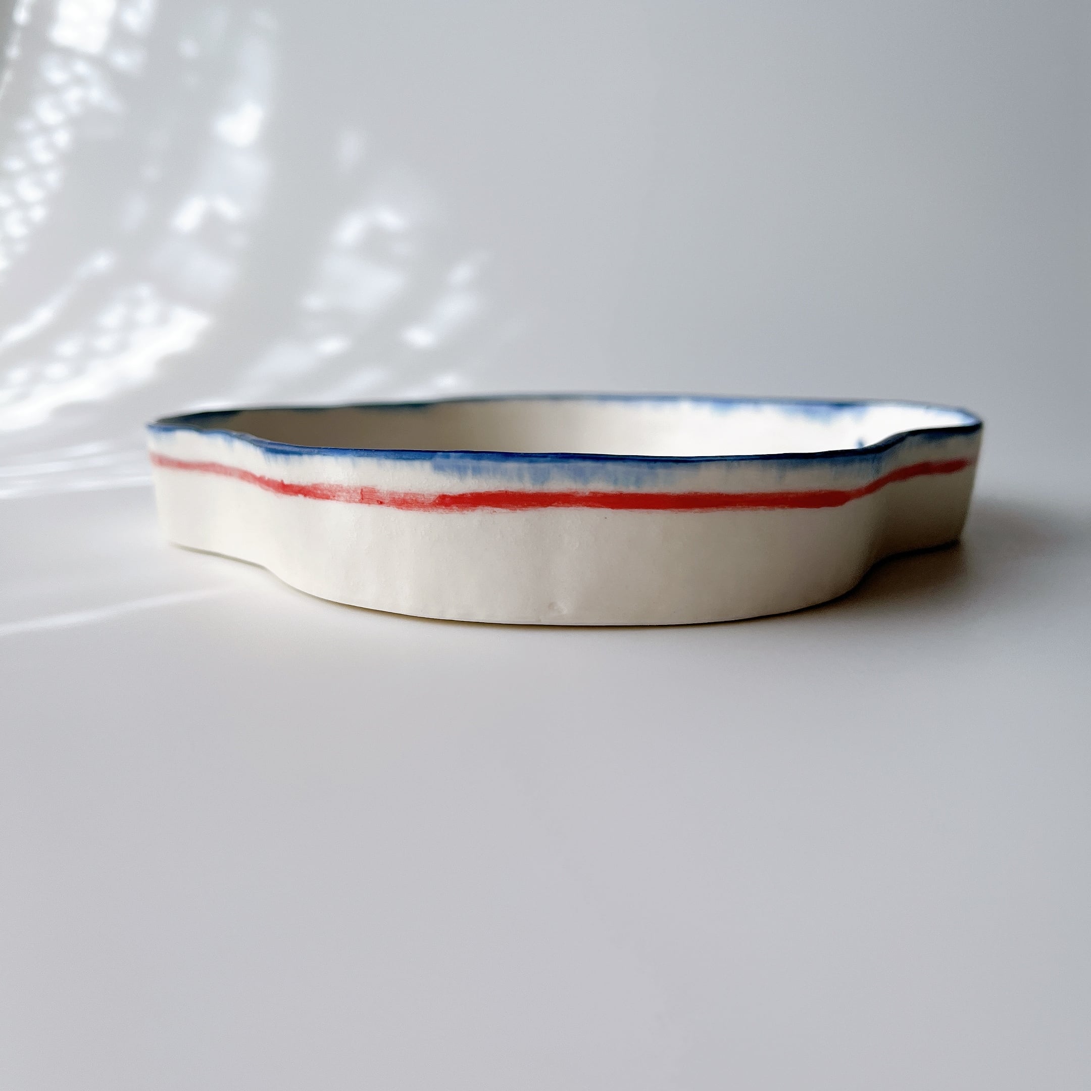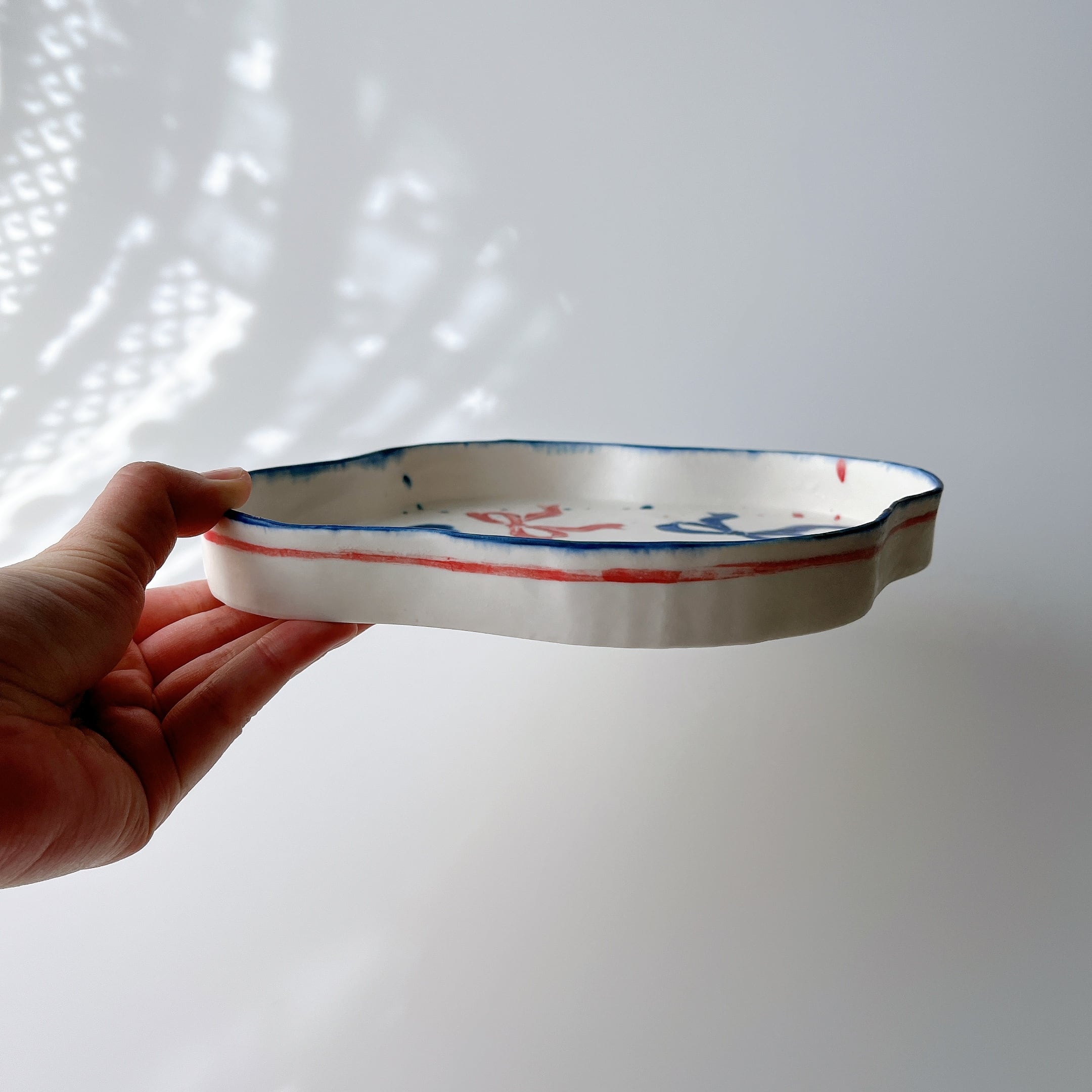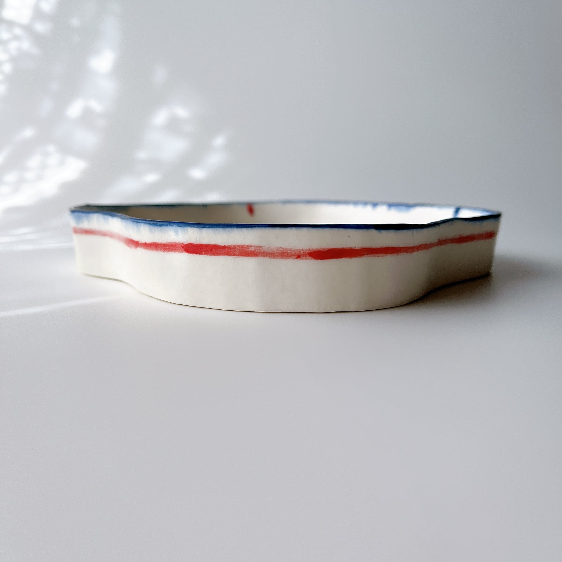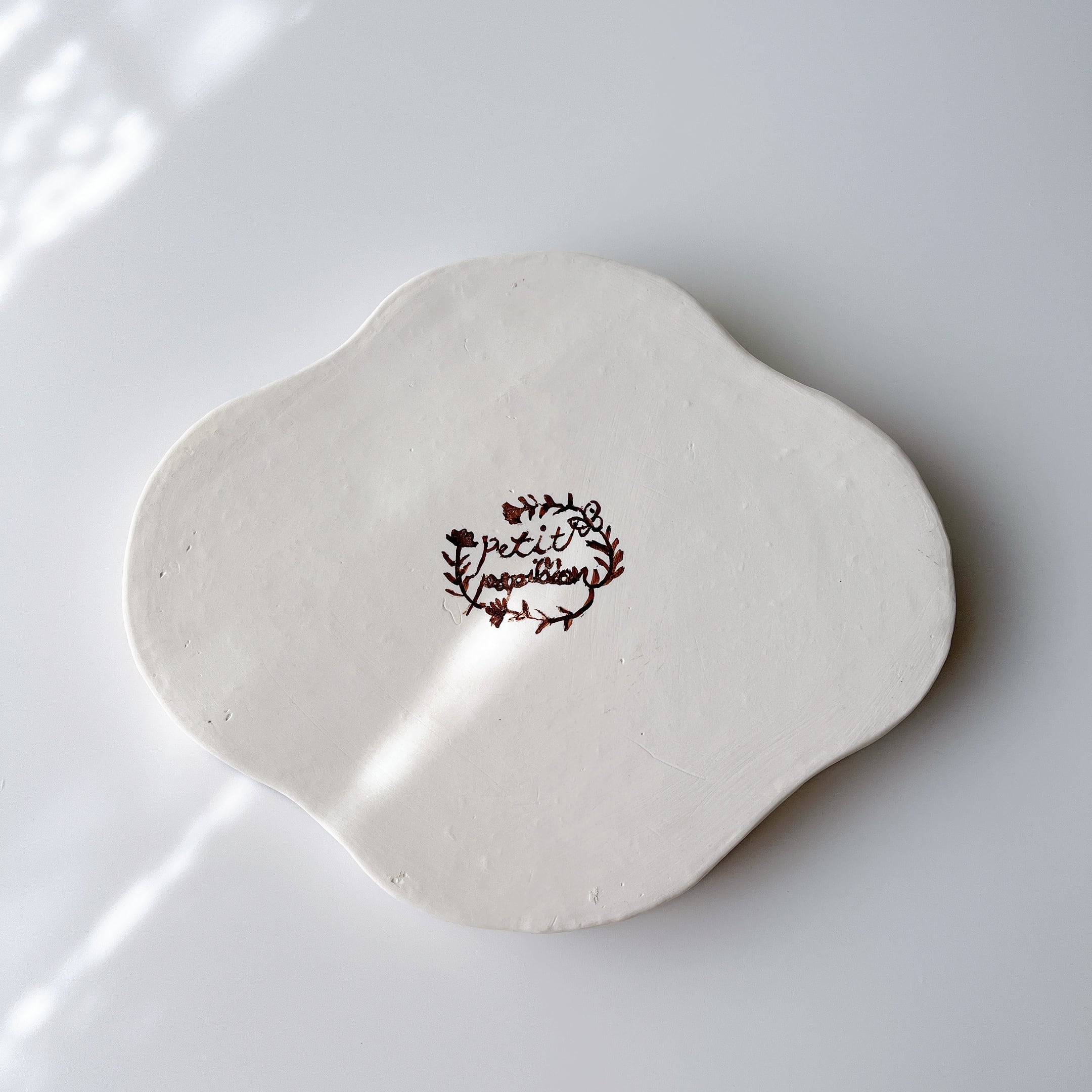 曲線が美しい、お花のような形のお皿に描かれた沢山のリボン。