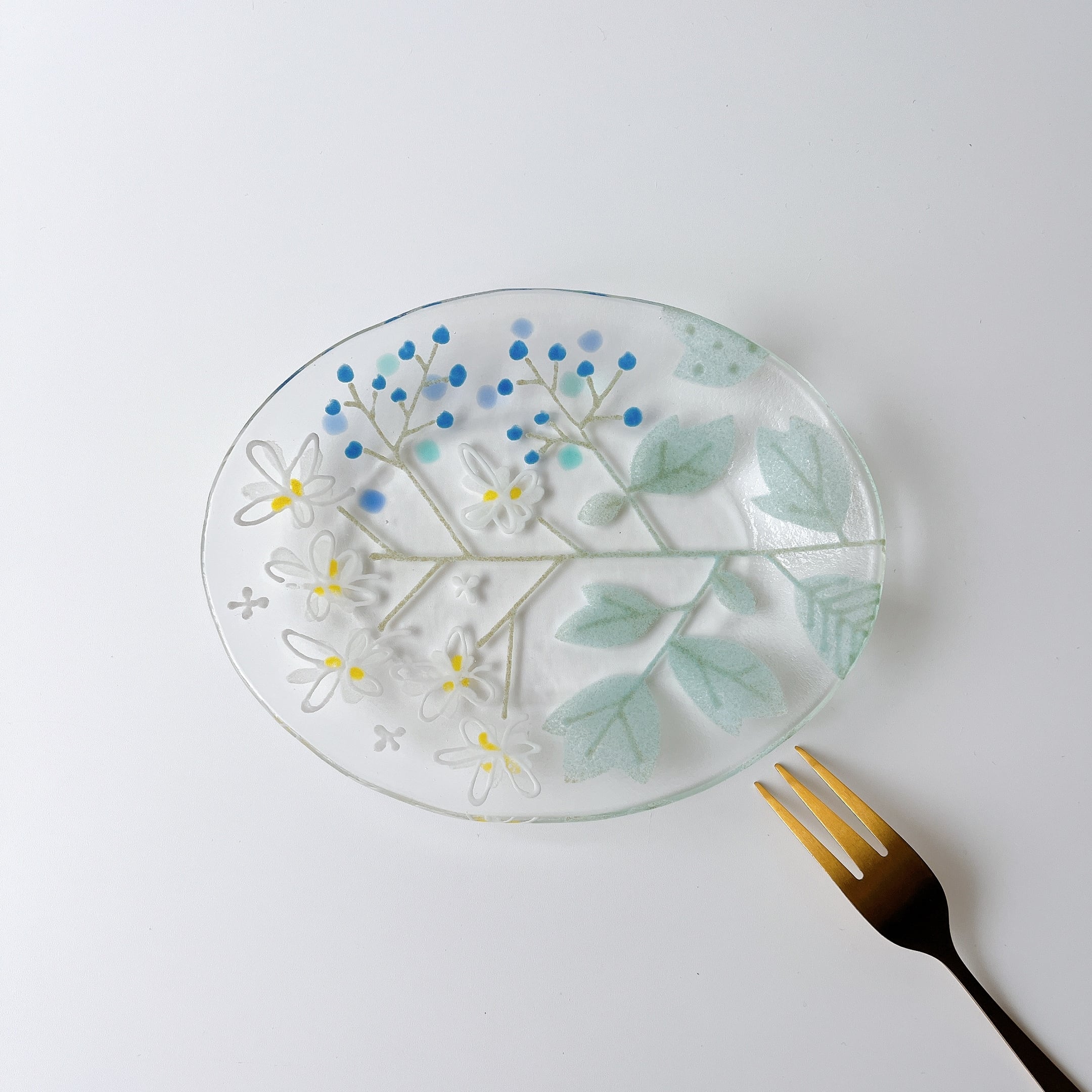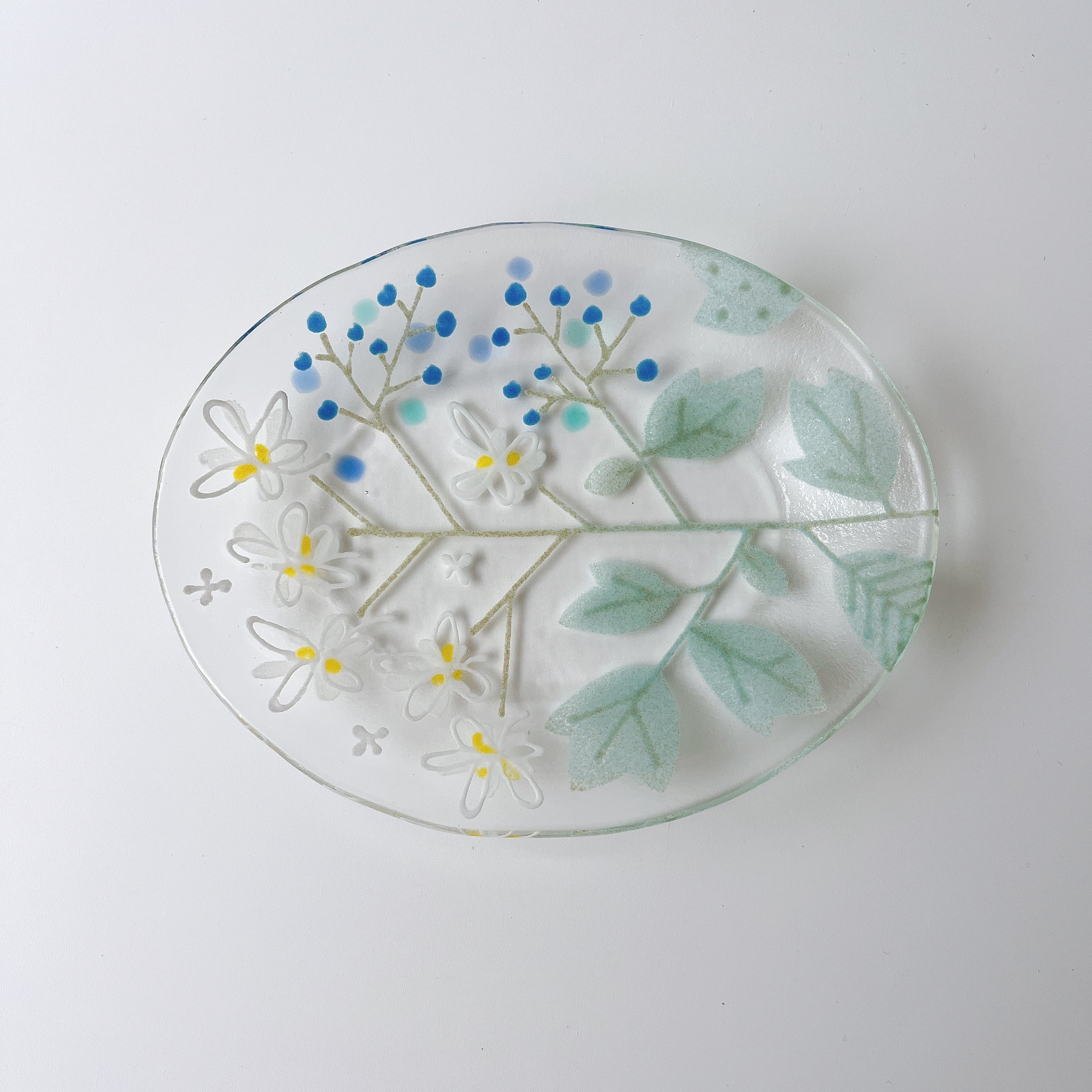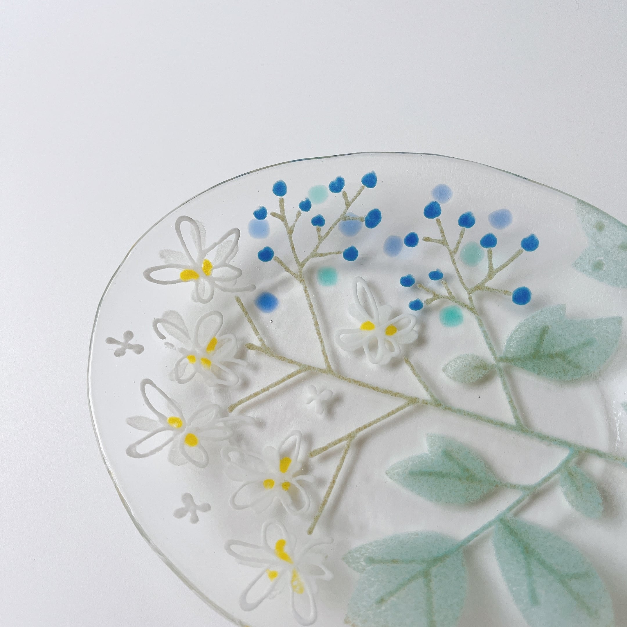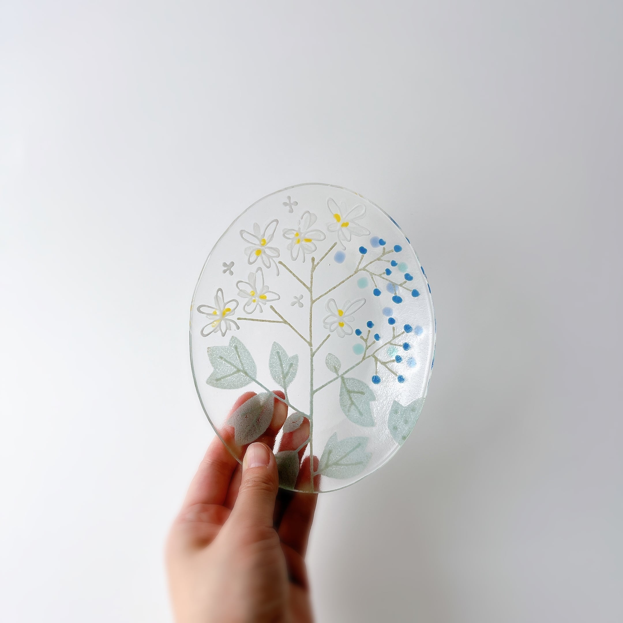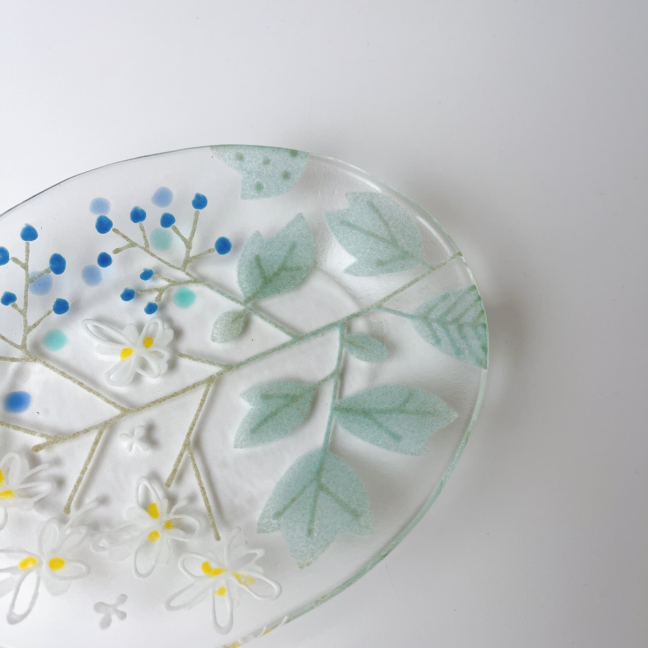 お花や葉っぱなどの植物が描かれた沖 知江子さんのガラスのプレート。