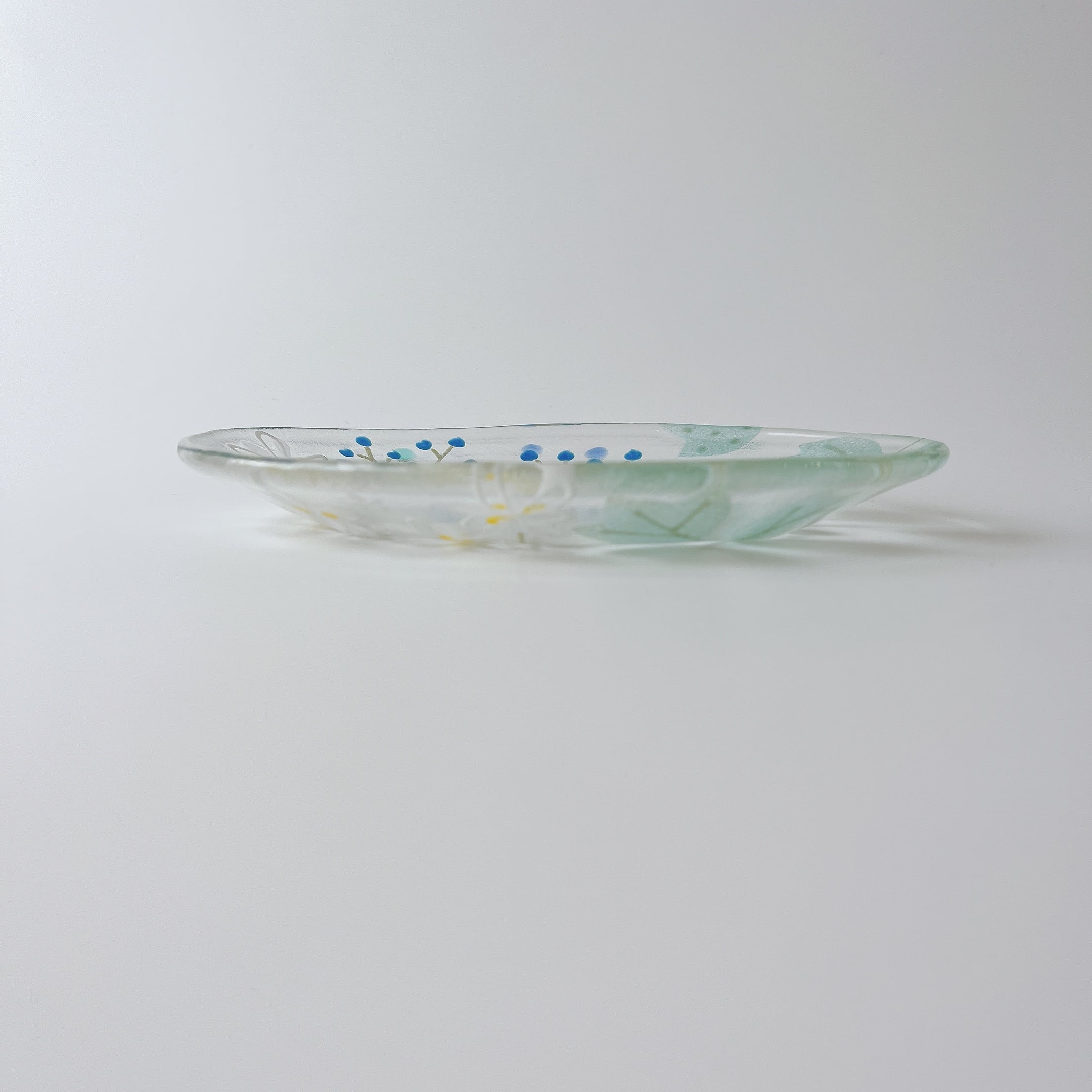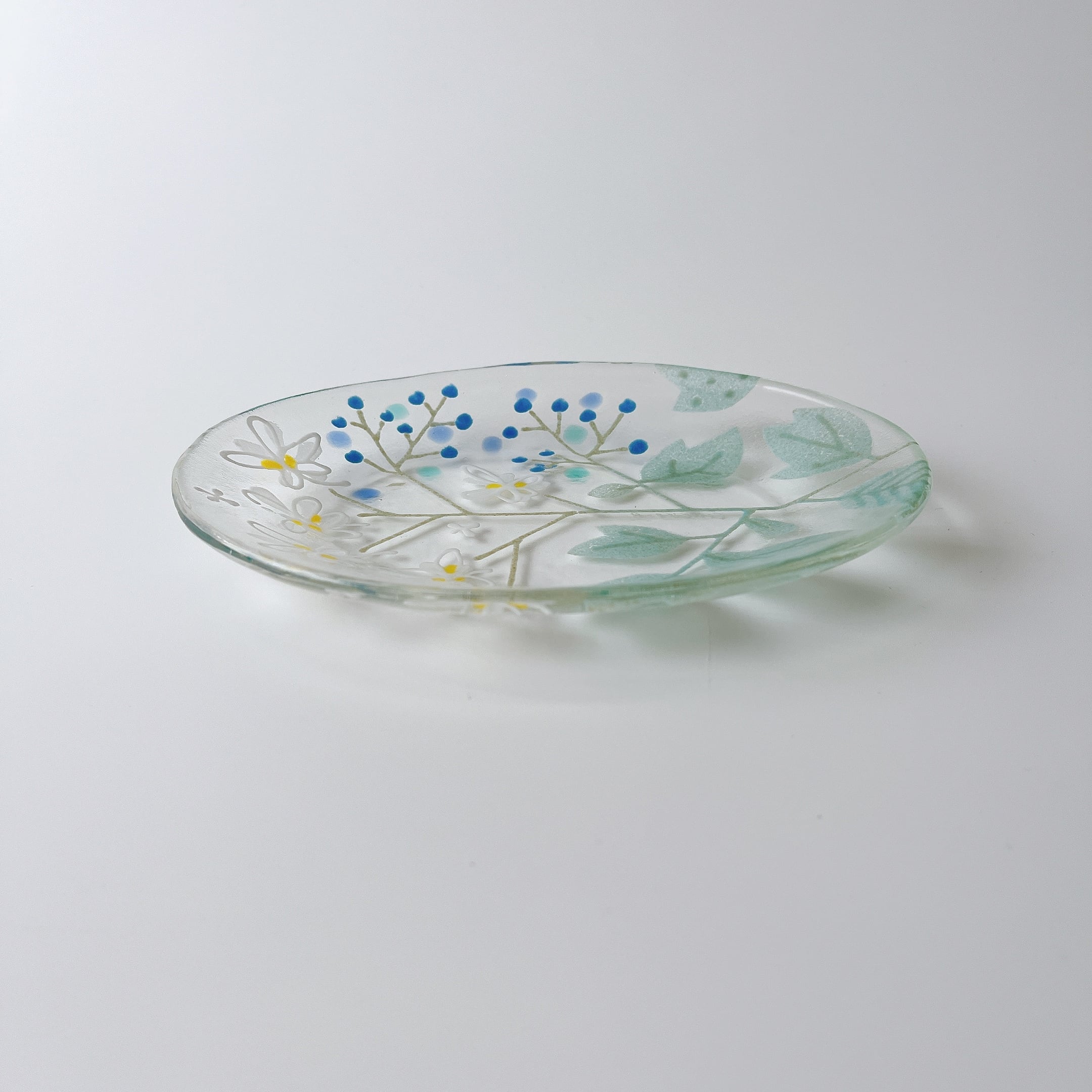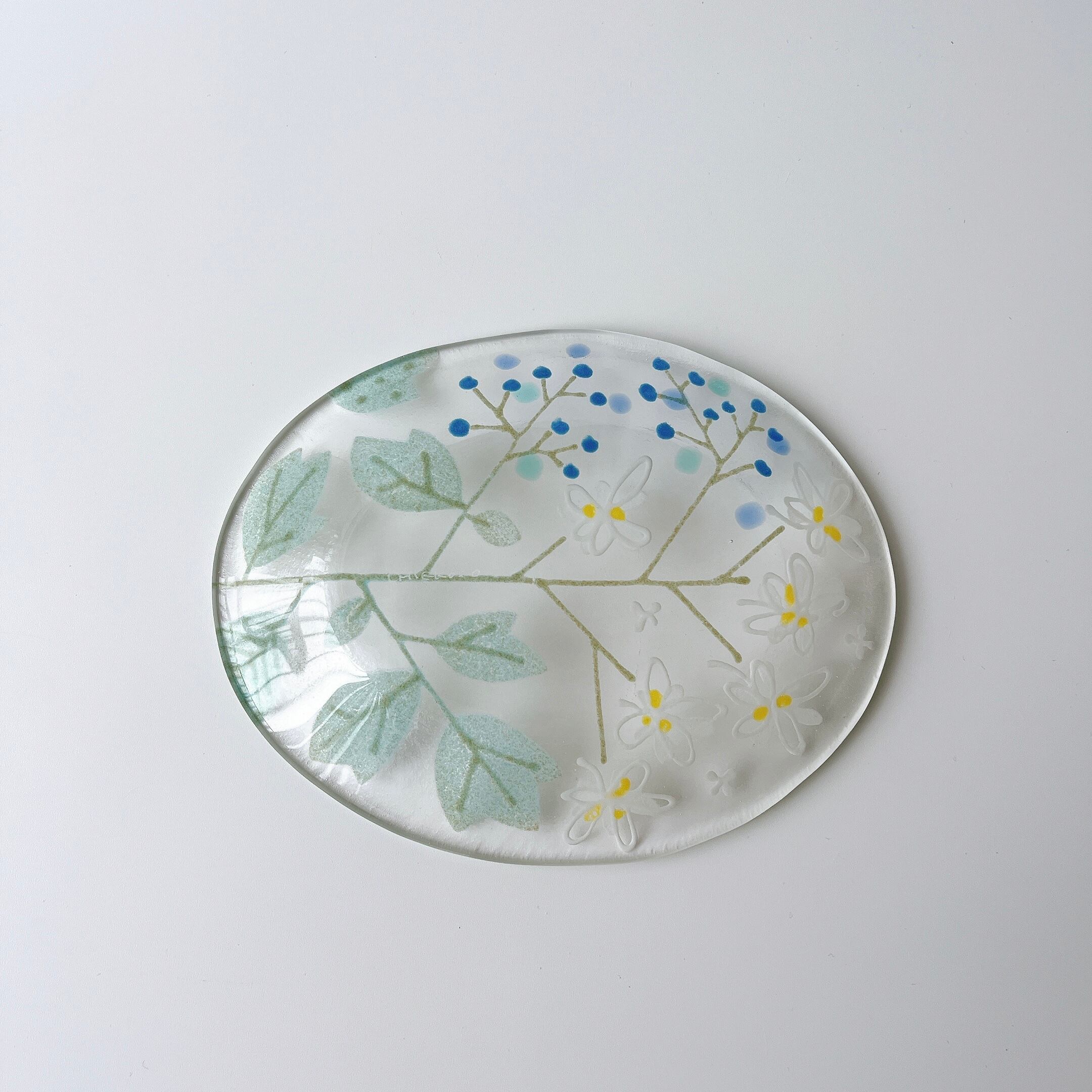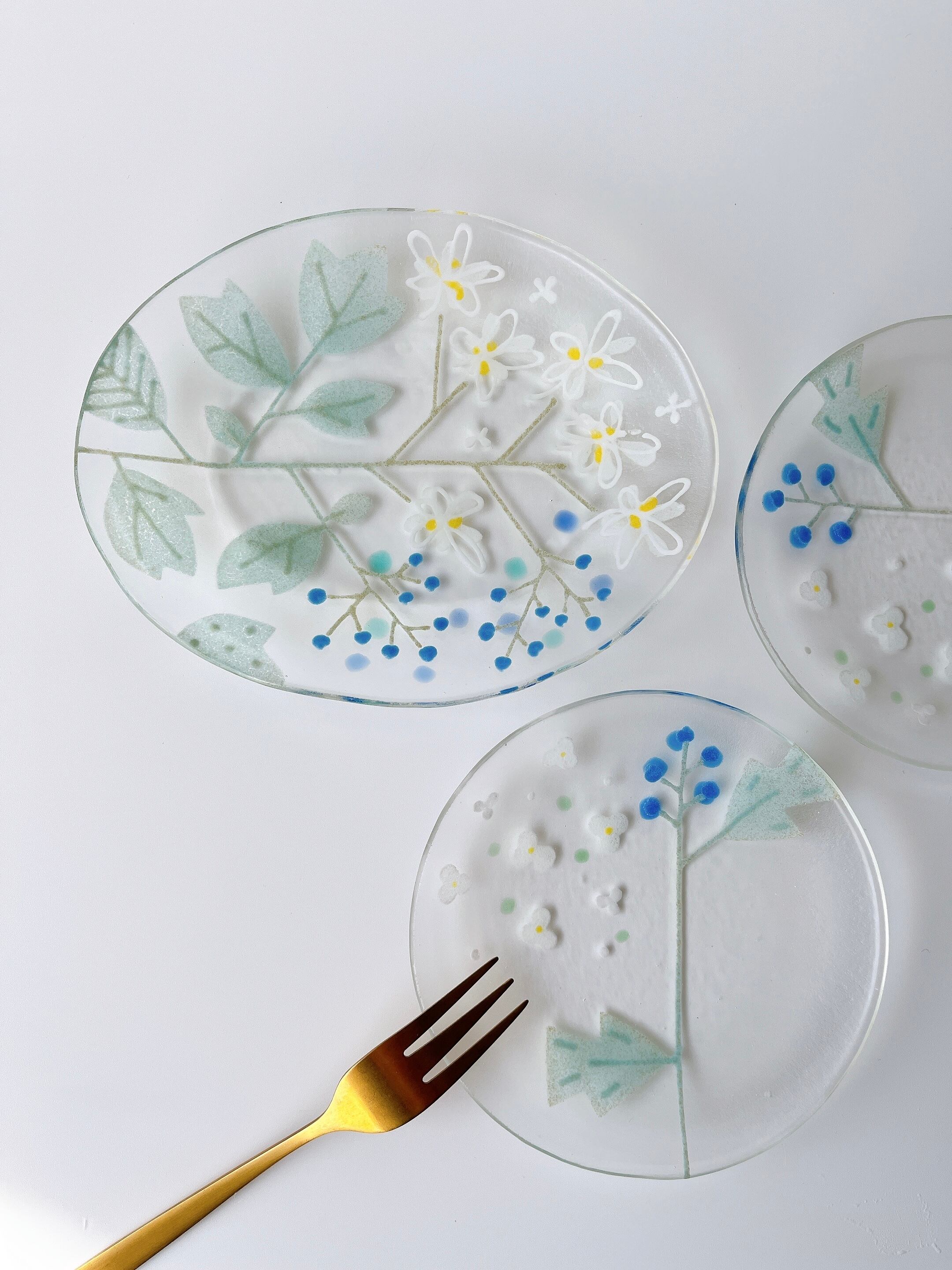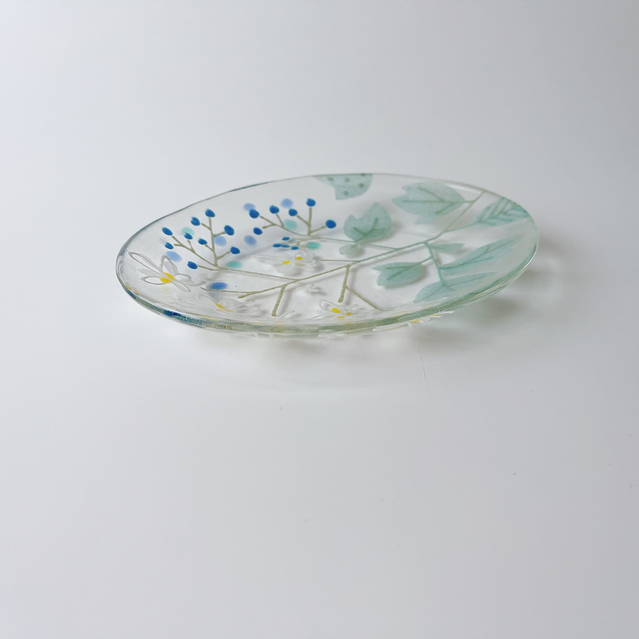 お花や葉っぱなどの植物が描かれた沖 知江子さんのガラスのプレート。