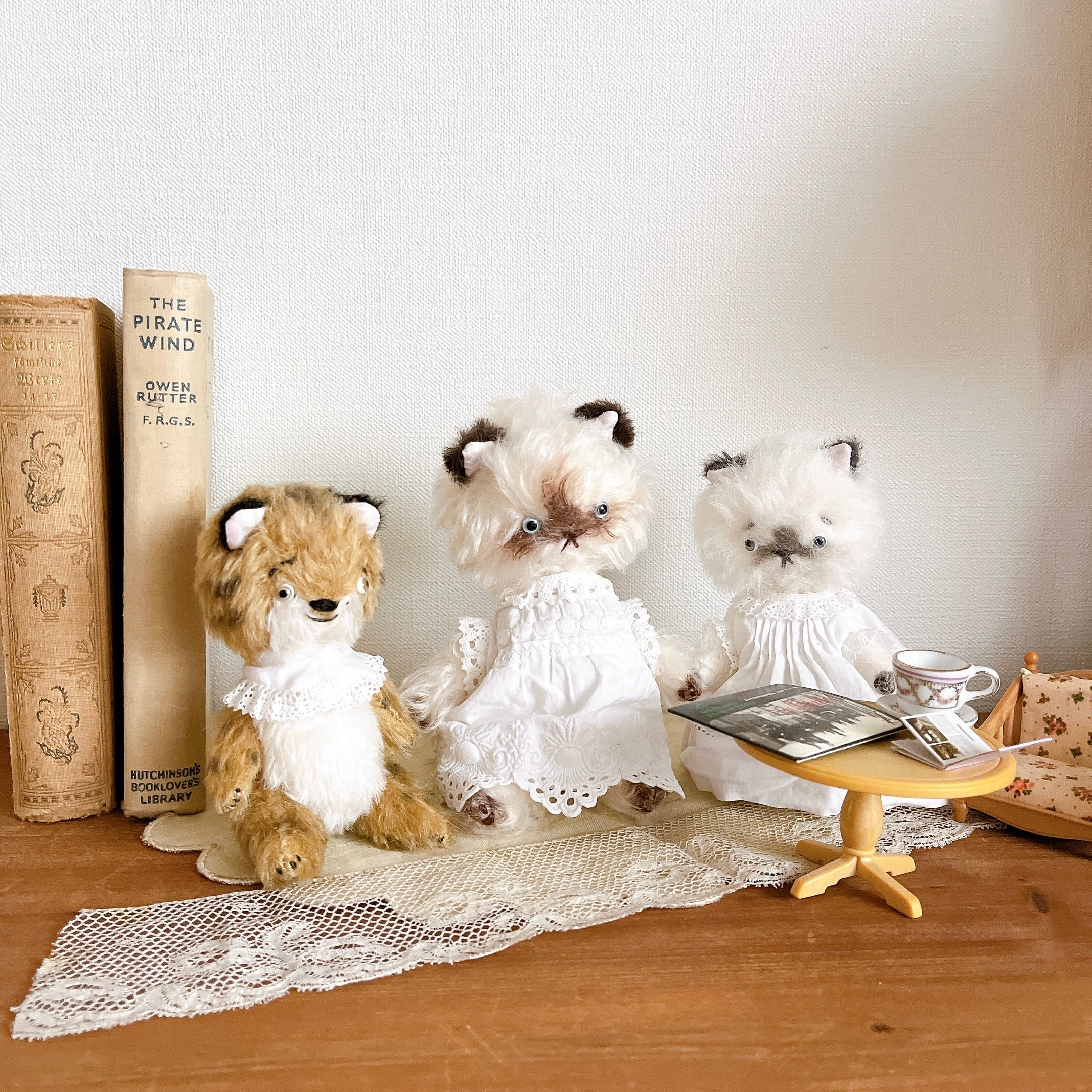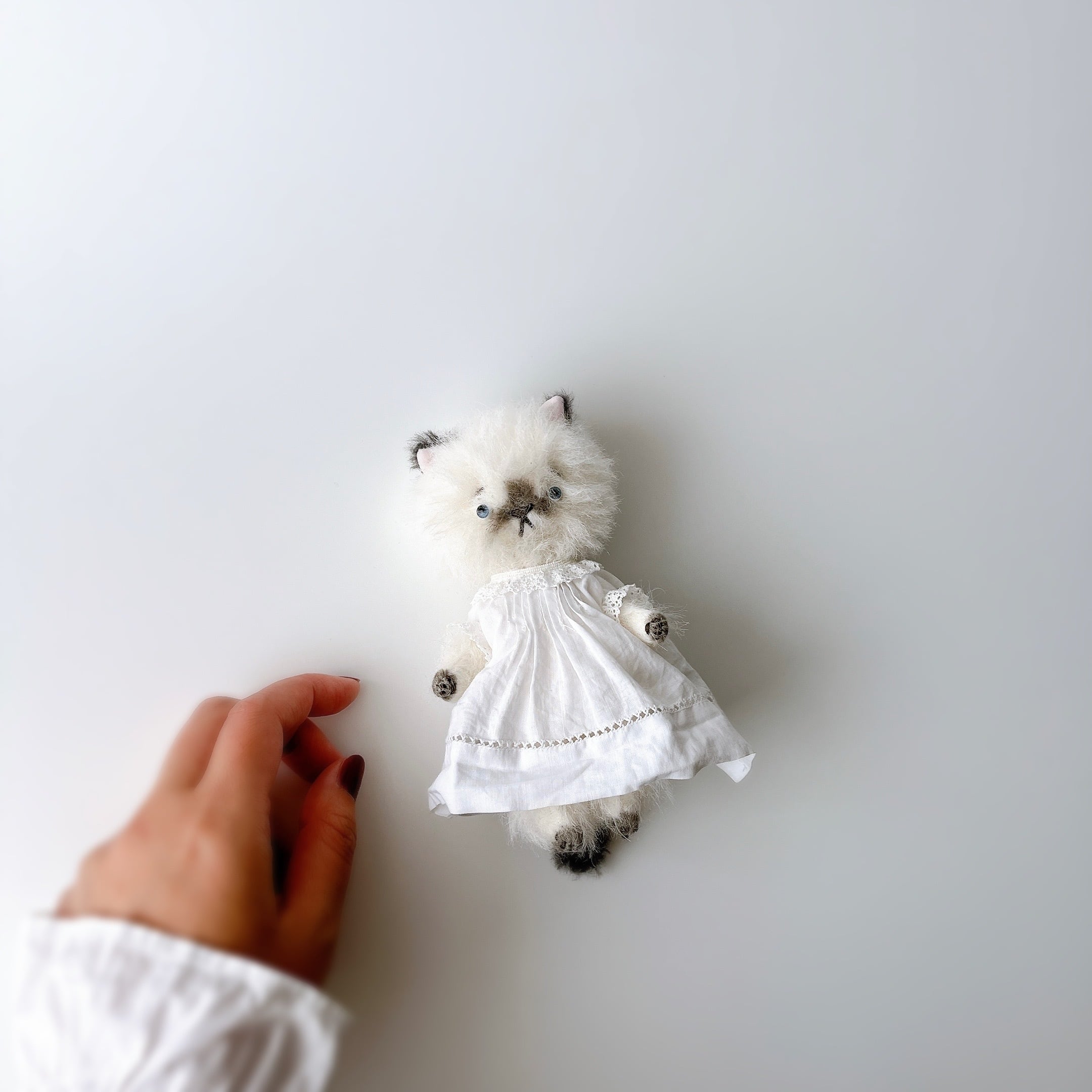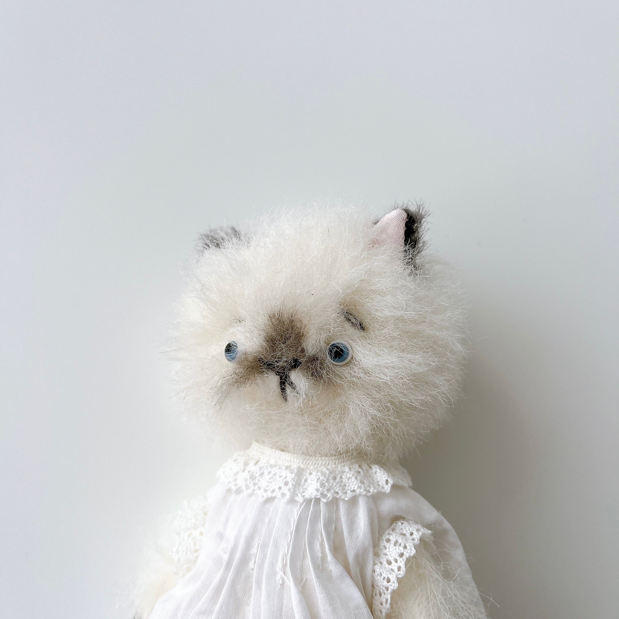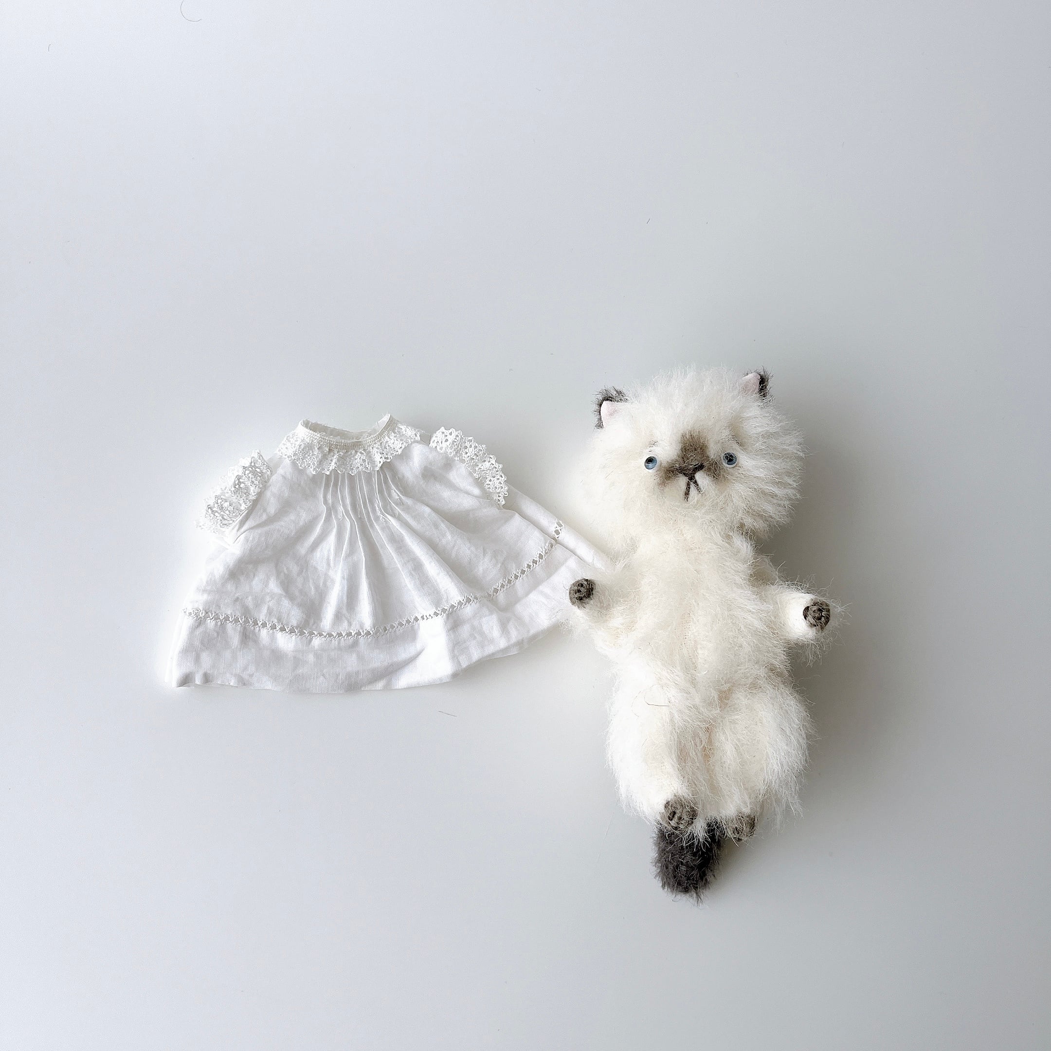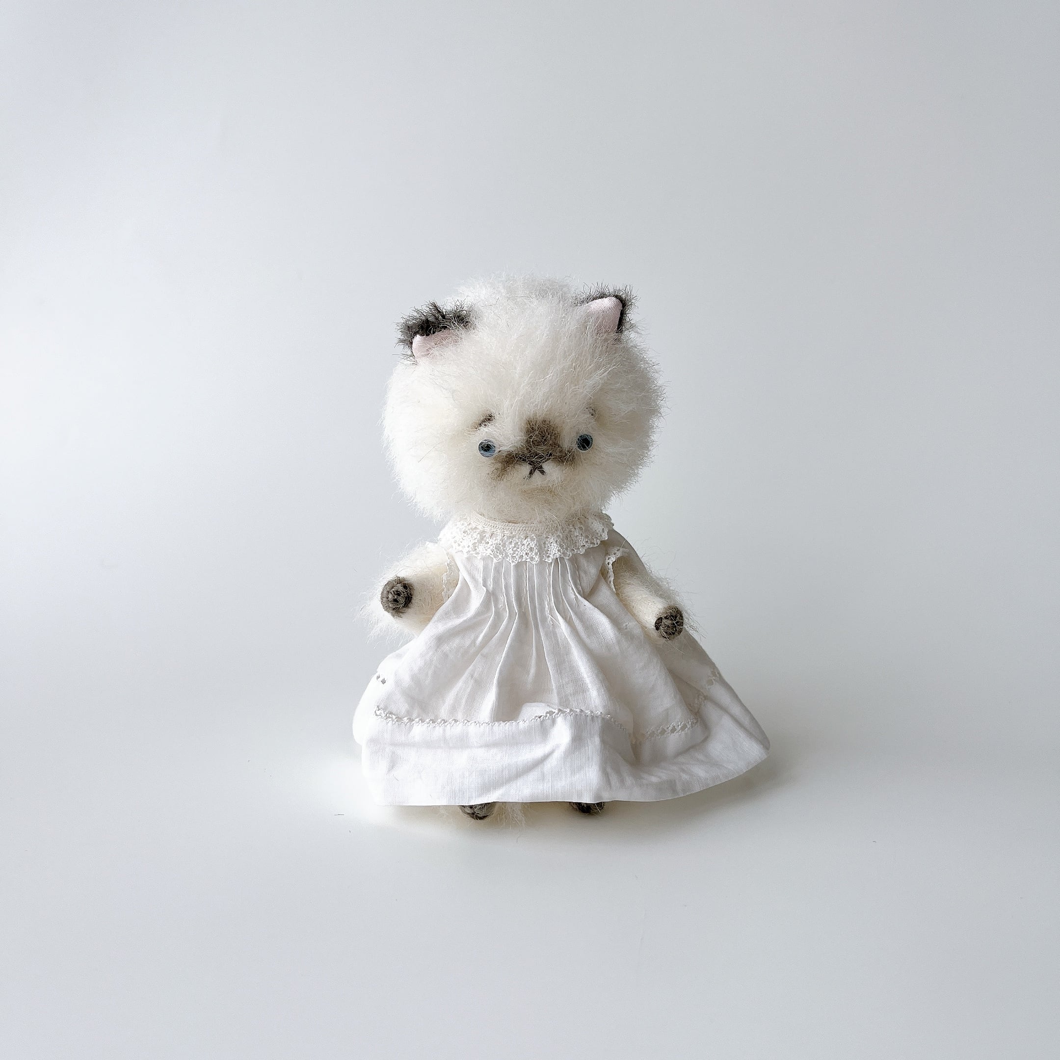 やさしい表情をしたシャムちゃん。ふんわりワンピ(お洋服も、さてさんがこだわって作られているのです)を着たお洒落さん!