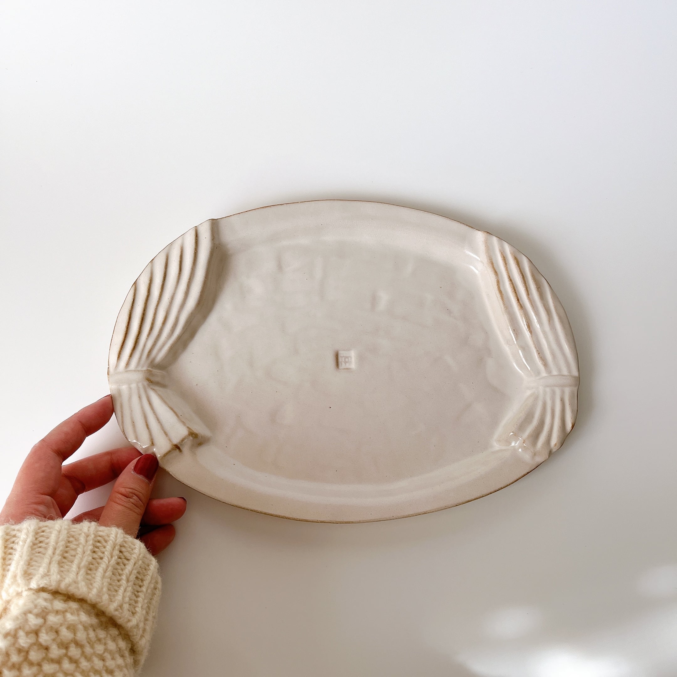 カーテンが両サイドにかかったなんともロマンティックなデザインのオーバルプレート。