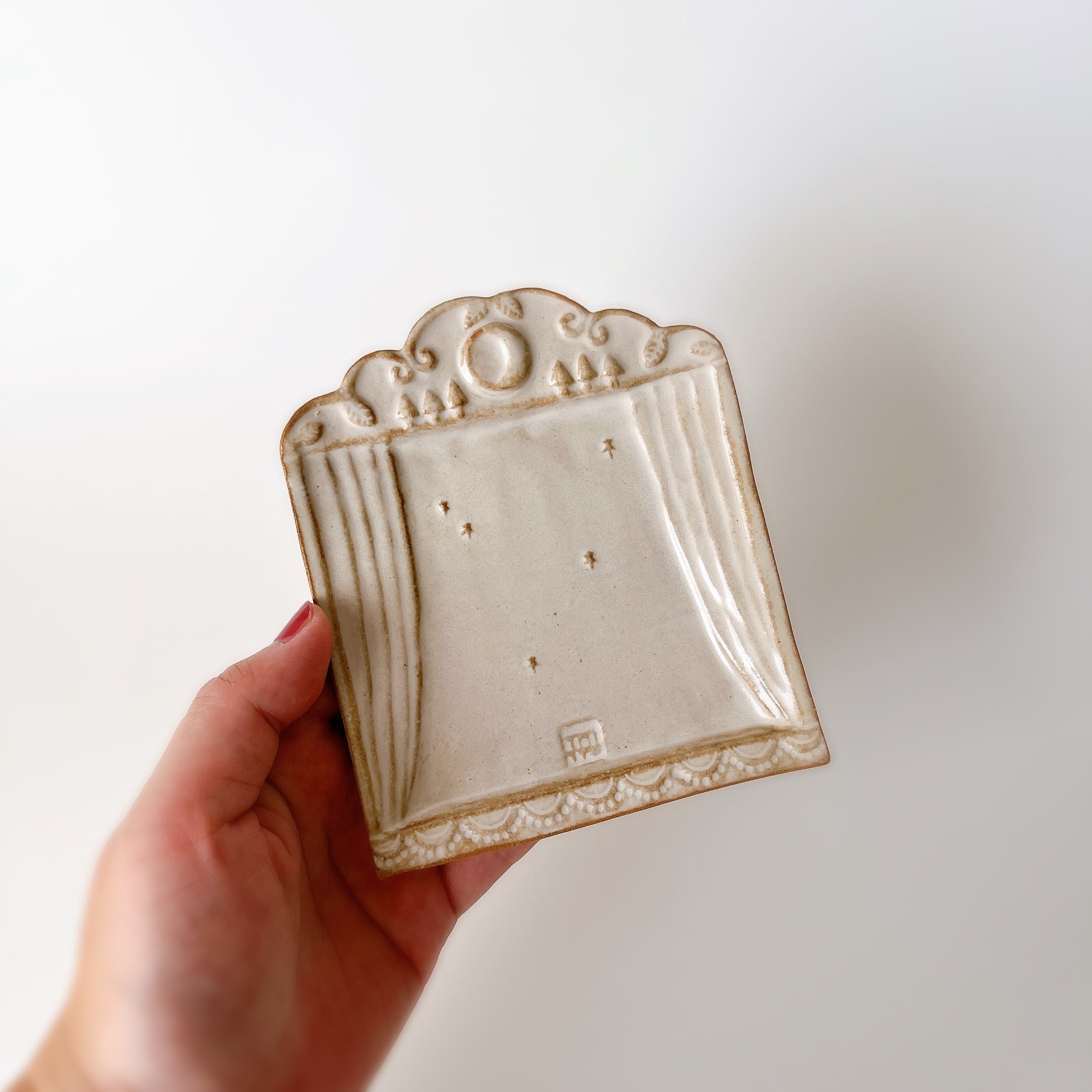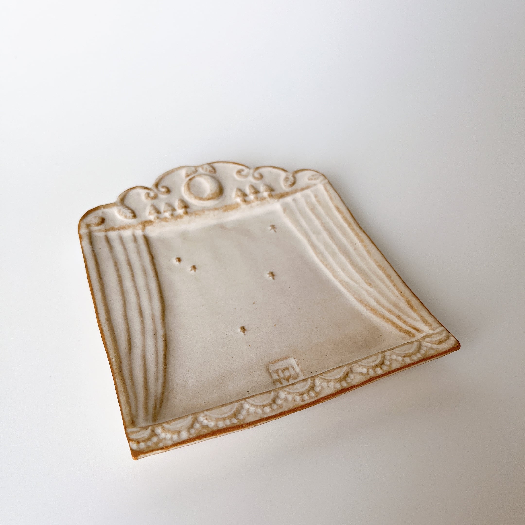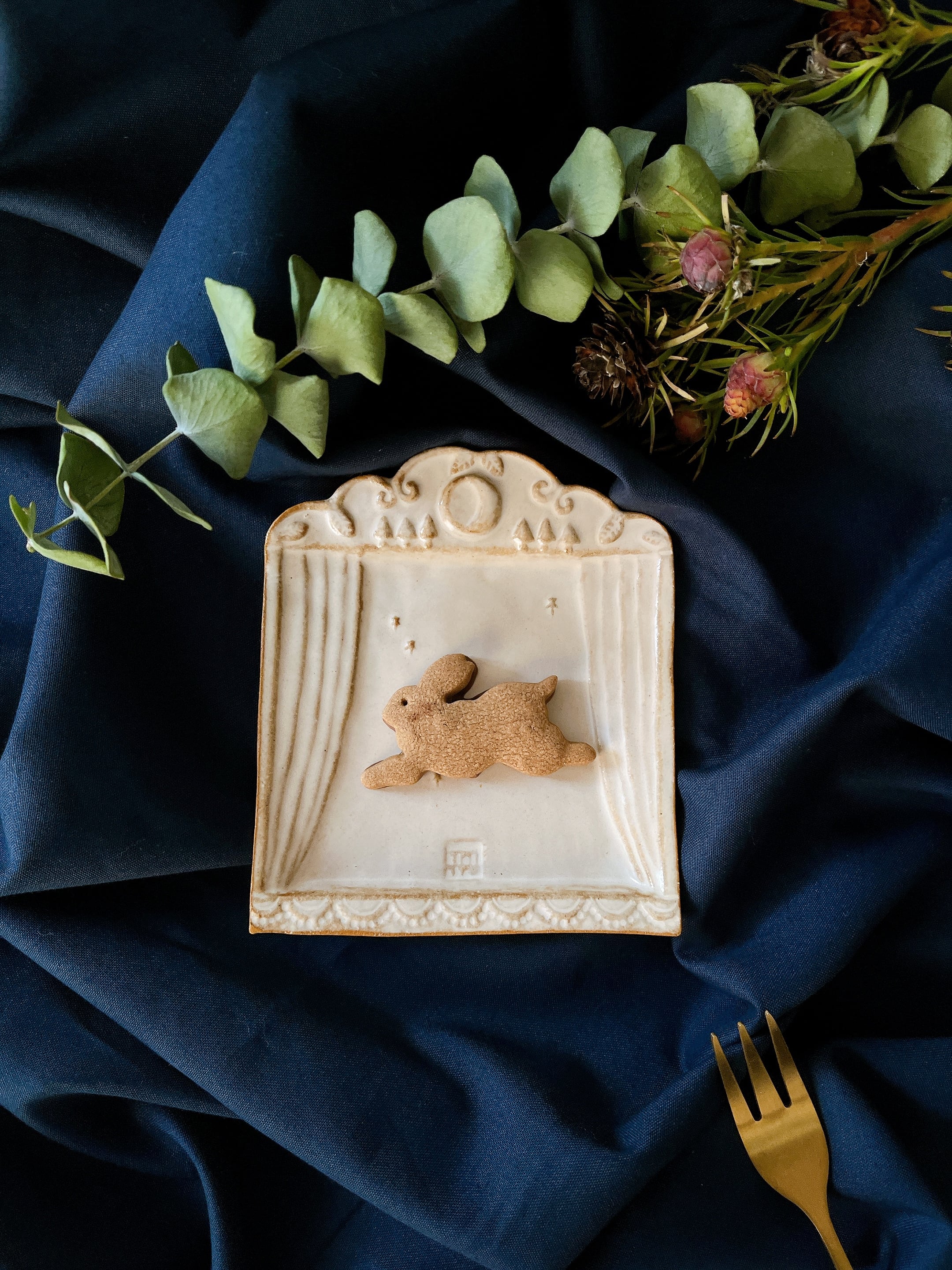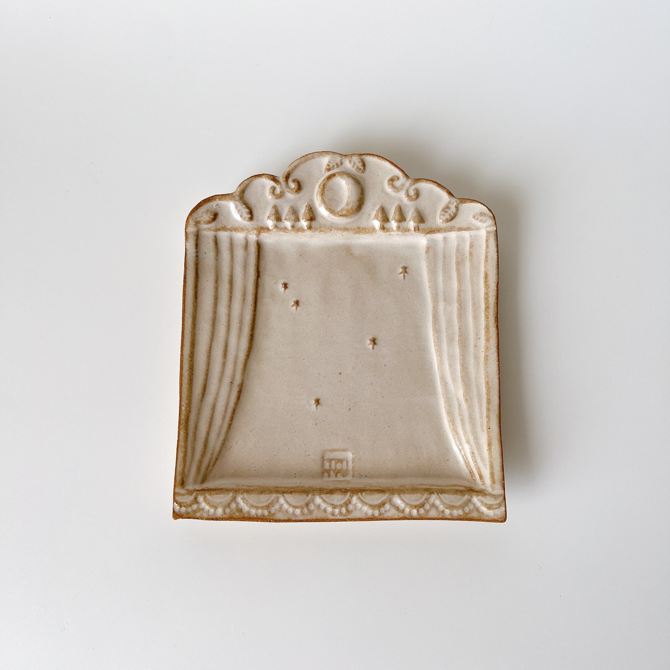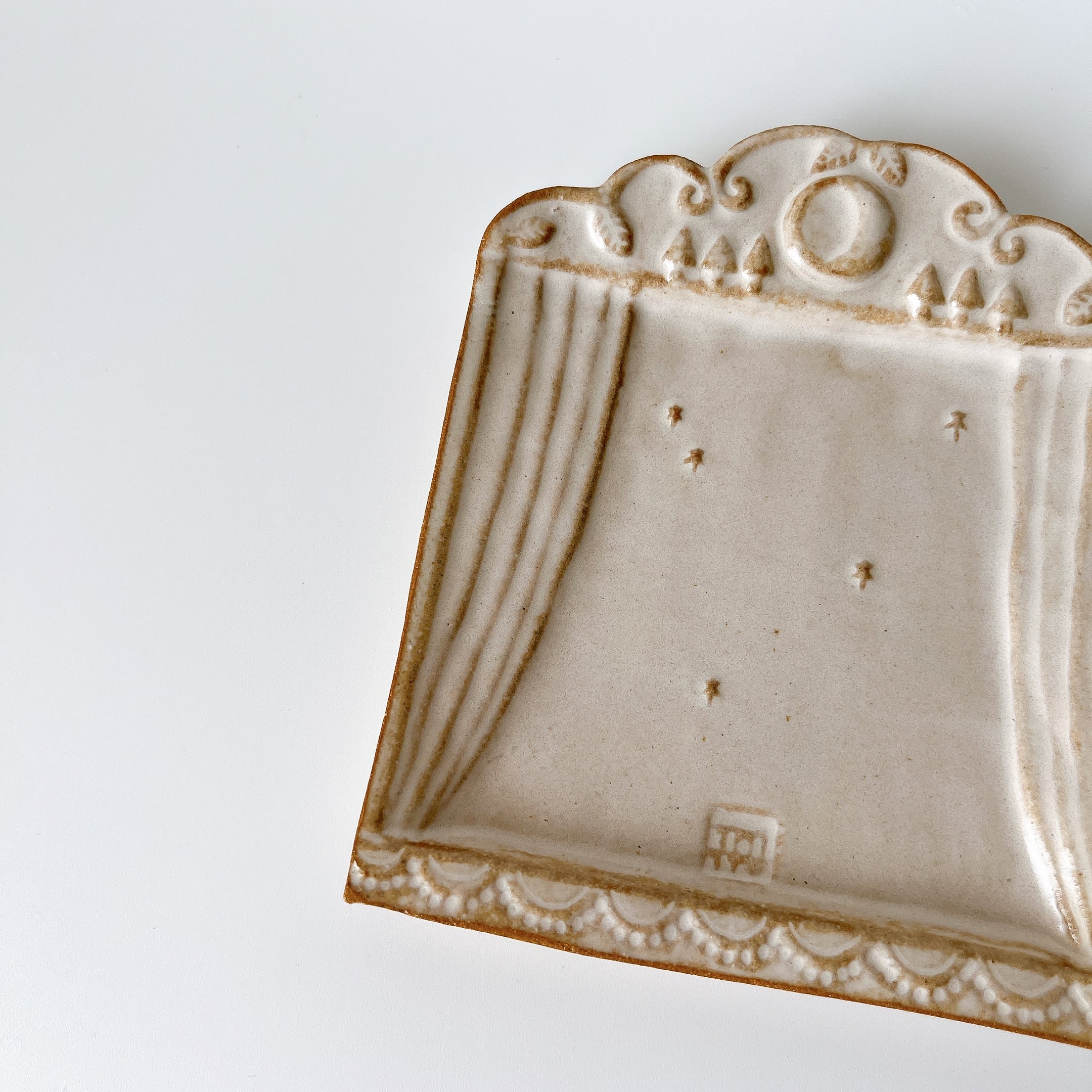 カーテンや夜空・森の木々がデザインされたなんだか夜の夢の様なプレート。